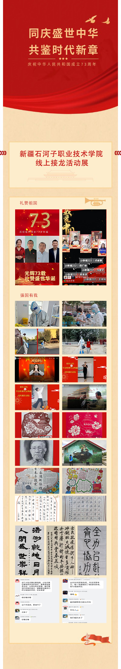 自10月1日起,学院师生的钉钉群、微信群被一条条对祖国母亲抒发爱意的信息刷屏。同学们以真挚的情感、朴实的语言、洪亮的嗓音、优美的舞蹈,把对祖国的热爱和赞美化成歌声与律动,祝福伟大祖国母亲,生日快乐;一把剪刀剪出一幅幅庄重喜庆的作品,记录了历史时代的变迁、讴歌了党的丰功伟绩、寄托了浓浓的家国情怀,表达了师生的美好祝愿;淡逸劲爽的国画、行云流水的书法,表白“与党同心,与国同行”,定格祖国的锦绣繁华,记录抗疫志愿服务和劳动实践的美好的青春模样。接龙活动精彩纷呈,广大石职院青年花式表达了爱党、爱国、爱校的赤忱之情,抒爱国情、立报国志,以赤诚之心守望鲜艳的中国红,是每一个人最坚定的追求,也是Beat365中文官方网站人对党、对祖国母亲最真挚的浪漫。