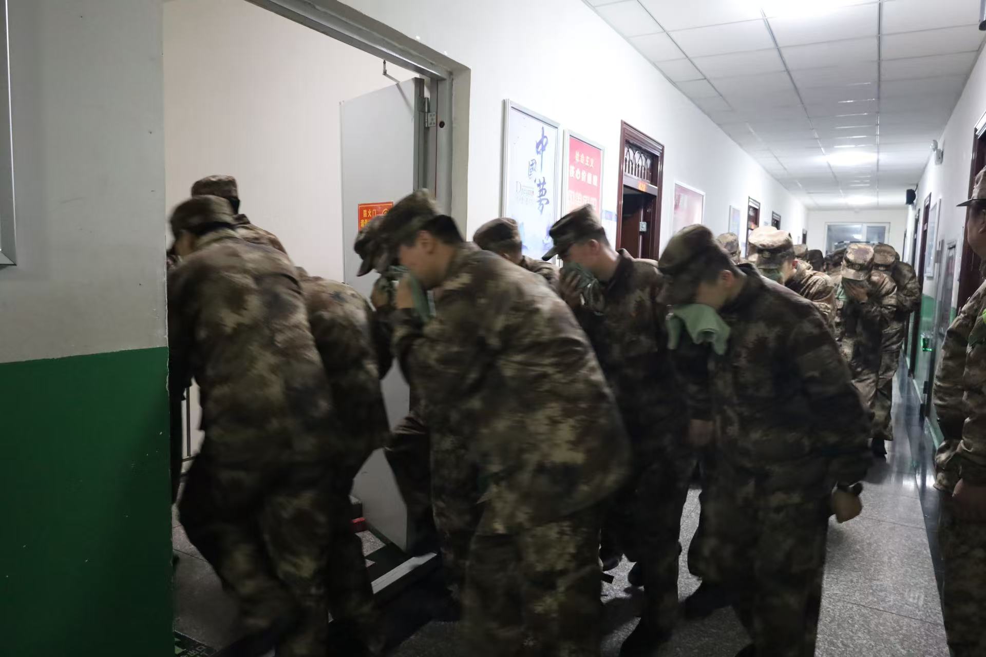 当日清晨,急促的警报声划破宁静,拉开逃生演习的序幕。正在宿舍休息的学生们迅速反应,此刻将纪律与秩序内化于心,按照教官平日教导,用湿毛巾捂住口鼻,低姿前行,迅速有序地撤离宿舍。在整个过程中,同学们不惊慌、不拥挤,沿着预定逃生路线快速疏散至安全区域。整个疏散过程紧张有序,达到了预期效果,充分展现了军士学院学生良好的纪律性和应急素养。