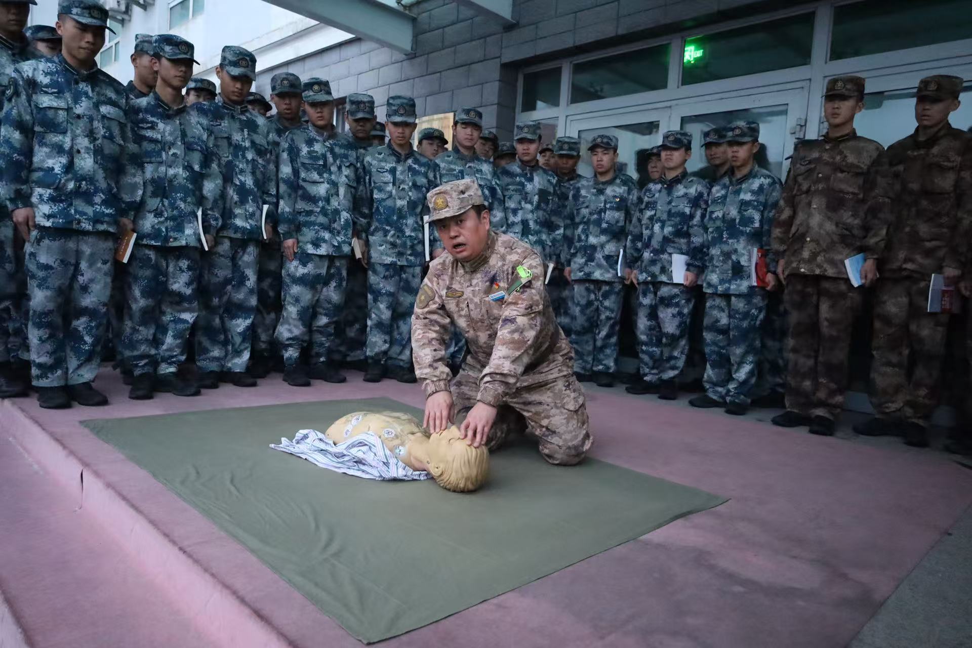 逃生演习结束后,军士学院教官李亮亮现场为学生讲解并演示了消防栓和灭火器的正确使用方法。教官详细介绍了消防栓的开启步骤、水带的展开方式以及水枪的瞄准技巧,同时,还针对不同类型灭火器的适用范围、操作要领进行了细致说明,并邀请学生亲自上手操作,确保大家都能熟练掌握这些灭火工具的使用方法。随后,为普及急救知识,李亮亮教官还进行了心肺复苏术的教学演示。从判断患者意识、检查呼吸和脉搏,到胸外按压的位置、频率和深度,以及人工呼吸的操作要点,都一一进行了标准示范,并通过模拟假人进行实操演练,让学生们近距离学习急救技能。