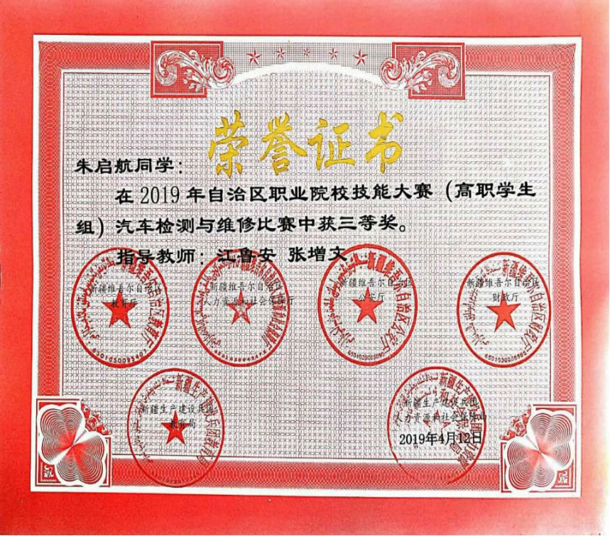 2019年4月士官学院包志伟、朱启航、马江江同学获得自治区职业院校技能大赛汽车检测与维修比赛中获三等奖。