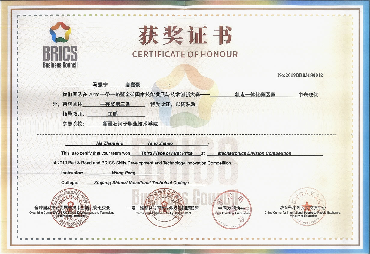 2019年9月,士官学院马振宁同学参加空军电器自动化“一带一路”暨金砖国家技能发展与创新大赛获得国家一等奖。
