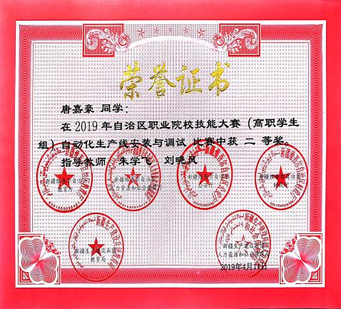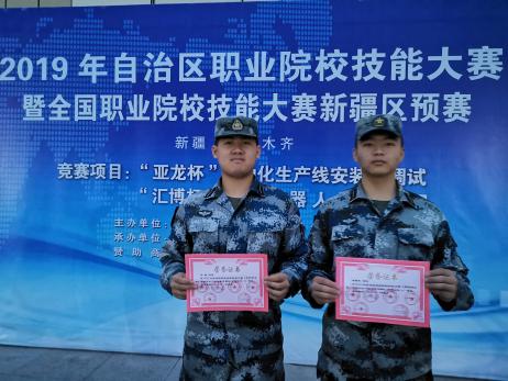 2019年4月,士官学院刘畅、唐嘉豪同学参加2019年自治区职业院校技能大赛高职组“自动化生产线安装与调试”赛项中获二等奖。