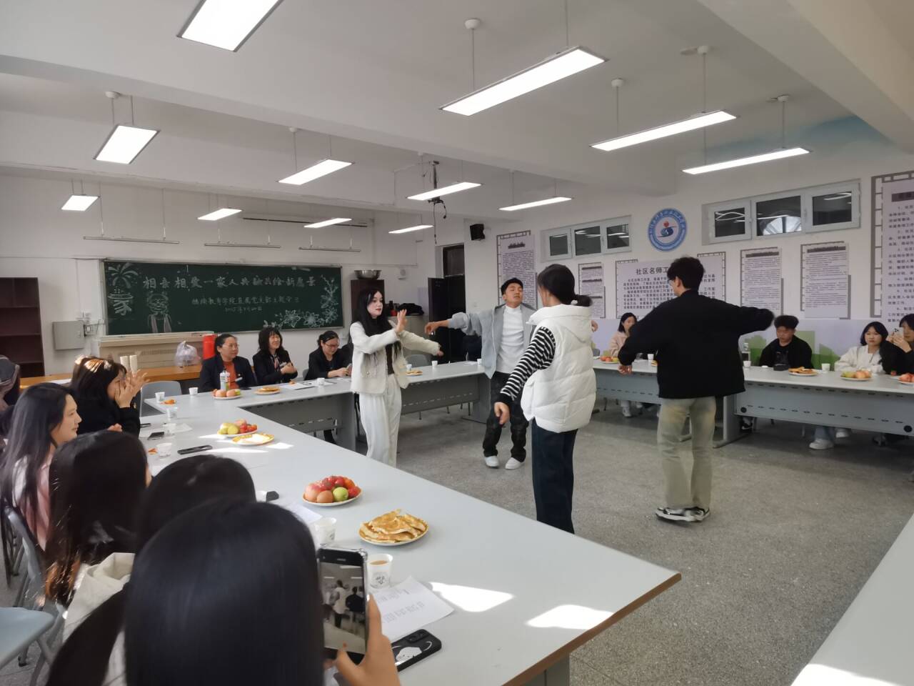 活动开场,党支部书记王国强以“铸牢中华民族共同体意识”为主题,深入阐释了本次活动的宗旨与价值,着重强调了铸牢中华民族共同体意识在新时代的重要性。在师生文艺活动展示交流环节,师生们一边品尝美食,一边欣赏富有民族特色的节目,石勇老师带领大家一同朗诵《年轻的城》。在交流互动环节,师生们积极发言,分享活动中的感悟、收获,以及对中华文化的理解。大家围绕党课内容、文艺表演和诗歌朗诵等畅所欲言,在交流中增进了解,在互动中加深情谊,以实际行动为铸牢中华民族共同体意识贡献力量。