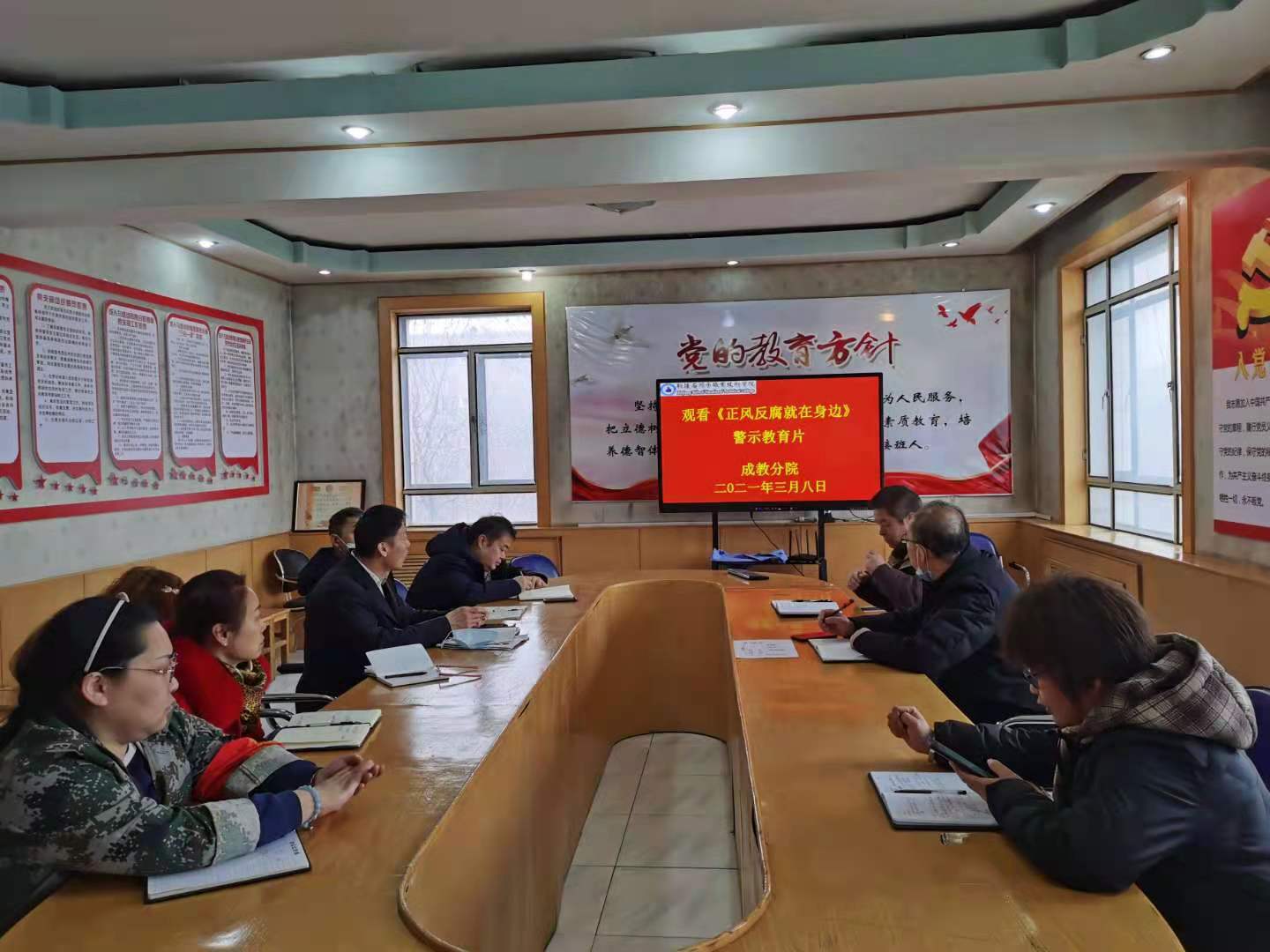 按照学院纪委的统一要求,成人与继续教育分院自2月24日开始专门动员通知全体观看了《正风反腐就在身边》警示教育片,并要求认真观看做好学习记录(手机截屏)。3月8日下午,在王国强院长的组织带领下,全体党员及教师在党员活动室又集体观看了《正风反腐就在身边》警示教育片并对活动进行了小结。