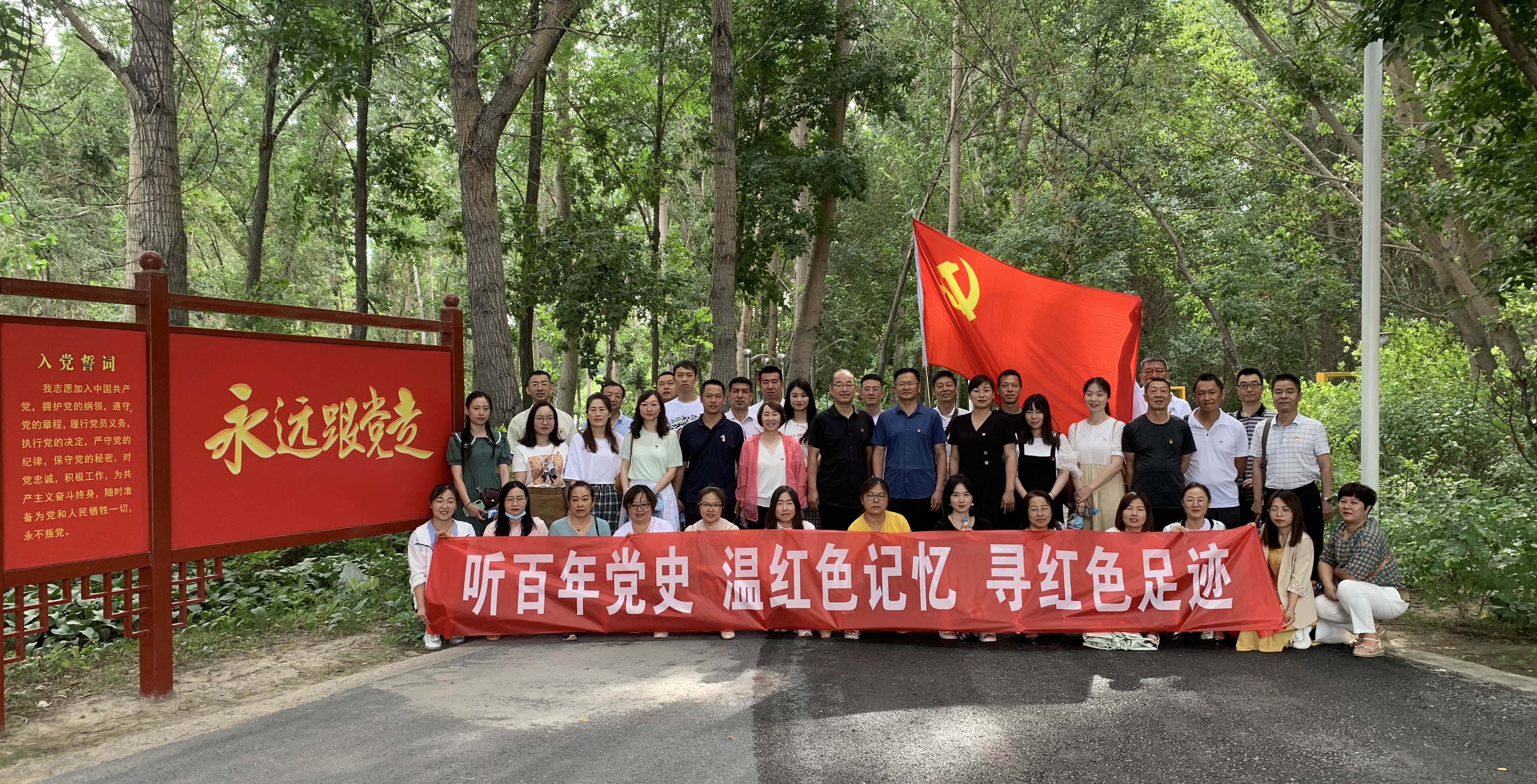 为庆祝中国共产党成立一百周年,2021年6月30日,中职分院党员教师相聚在玛河公园红色教育基地,开展 “党旗映天山”七一主题党日活动。