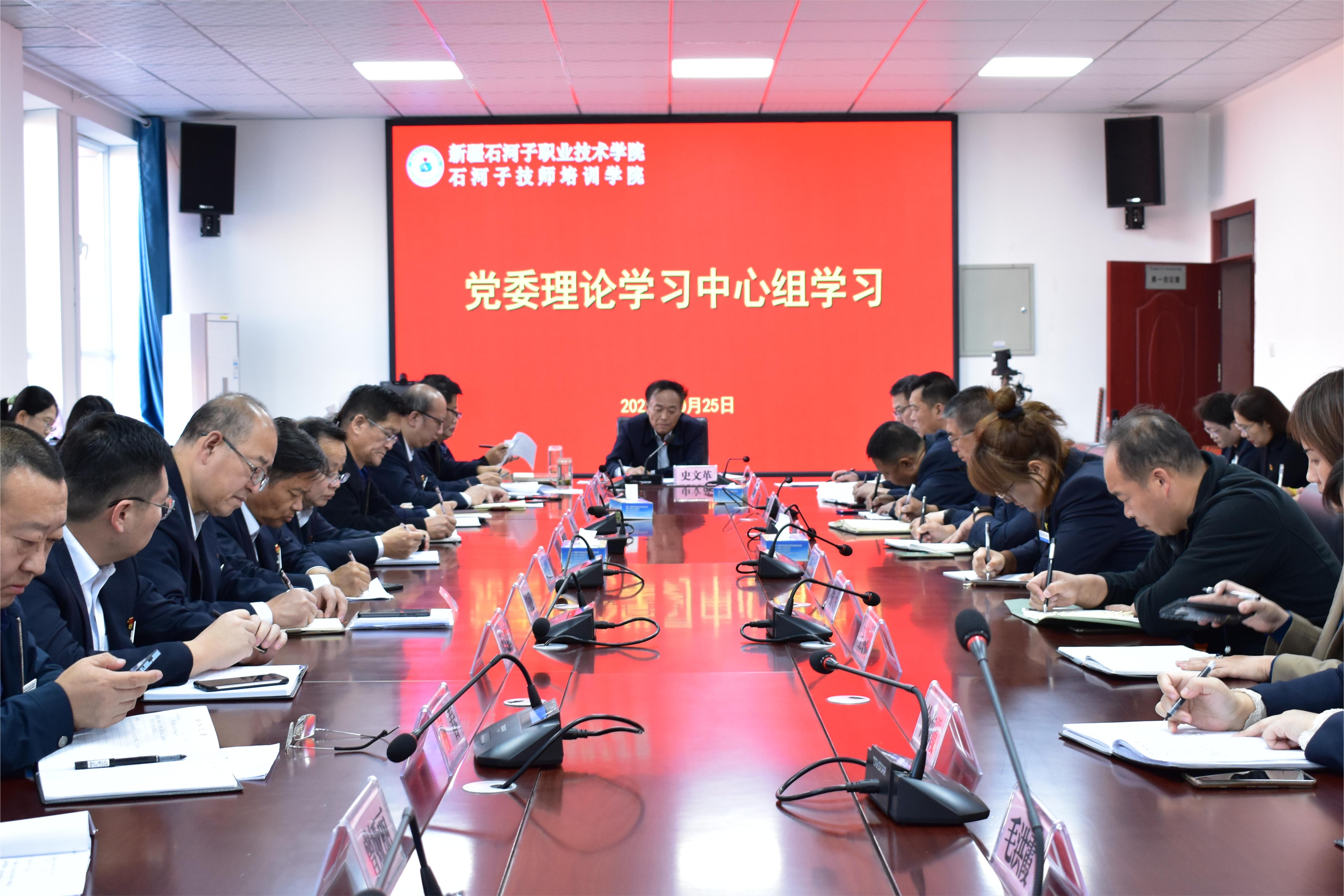 (王需 杨慧报道)2023年10月25日下午,Beat365中文官方网站党委举行党委理论中心组在行政楼3楼会议室集体学习,党委书记史文革主持会议并传达学习师市党委九届六次全会精神,学院院长林炯,纪委书记万祥军,副院长褚衍兵、张金果,各部门负责人,各分院书记、院长参加会议。