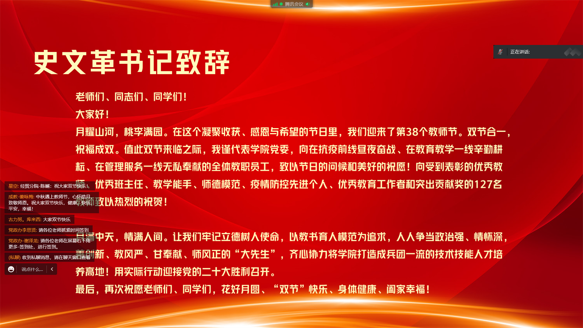 学院党委书记史文革做总结发言,代表学院党委向在抗疫前线昼夜奋战、在教育教学一线辛勤耕耘、在管理服务一线无私奉献的全体教职员工,致以节日的问候和美好的祝愿,向受到表彰的优秀教师、优秀班主任、教学能手、师德模范、疫情防控先进个人、优秀教育工作者和突出贡献奖的127名教师致以热烈的祝贺,总结了一年来学院在全体教职工的共同努力下取得的一系列成绩,号召大家要按照习近平总书记提出的期望与要求,牢记立德树人使命,以教书育人模范为追求,人人争当政治强、情怀深,善创新、教风严、甘奉献、师风正的“大先生”,齐心协力将学院打造成兵团一流的技术技能人才培养高地!用实际行动迎接党的二十大胜利召开!