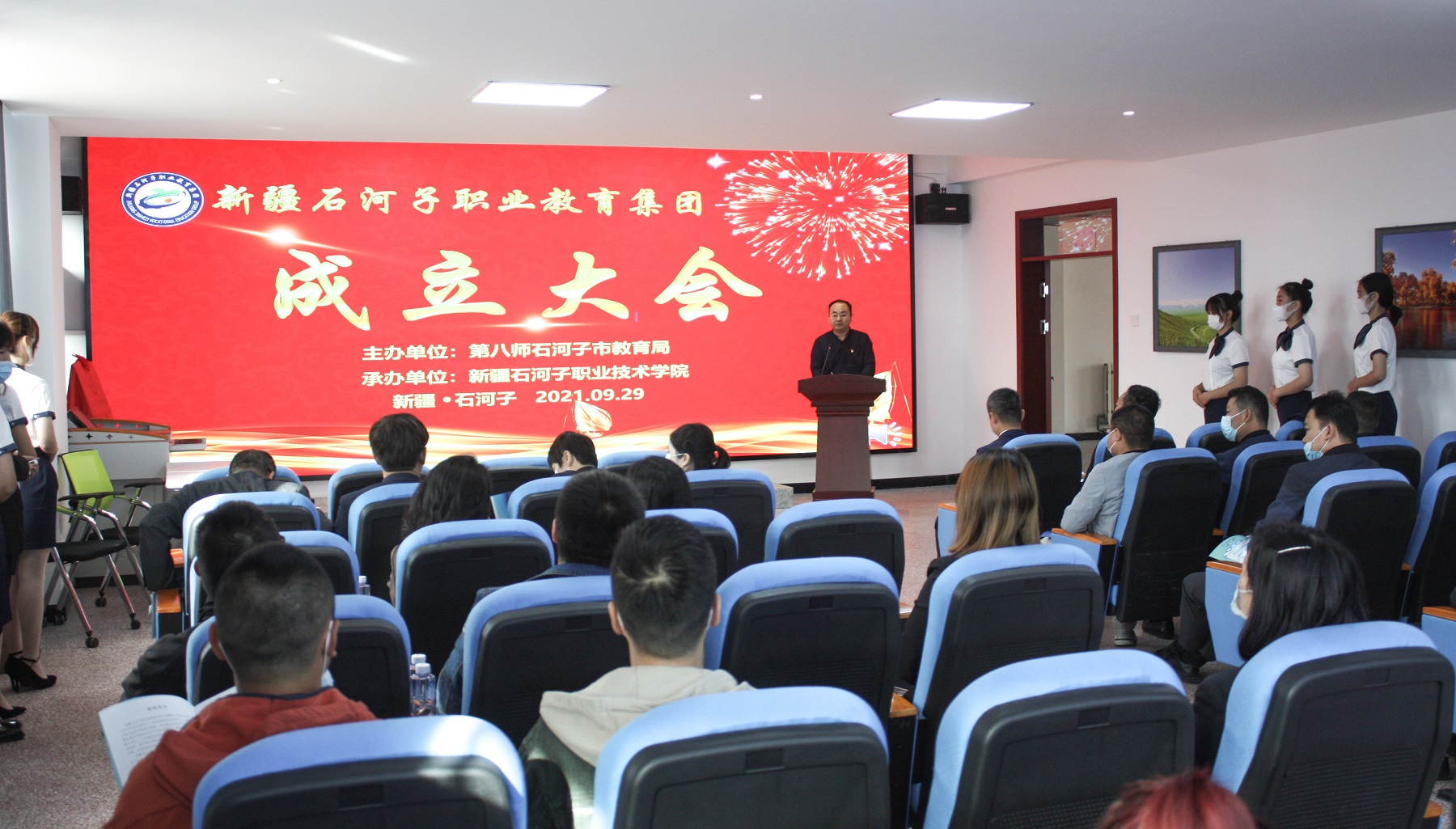 2021年9月29日上午,Beat365中文官方网站高朋满座、群英荟萃,新疆石河子职业教育集团正式揭牌成立。成立大会由Beat365中文官方网站副院长张涛主持,师市教育局副局长王志祥、Beat365中文官方网站党委书记史文革、新疆石河子师范学校校长吴志远、石河子卫生学校校长牛玉江、新疆西部合盛硅业有限公司人力资源部经理葛磊、新疆天业节水灌溉股份有限公司总经理杨万森等院校领导及职教集团企业代表参加了成立大会。
