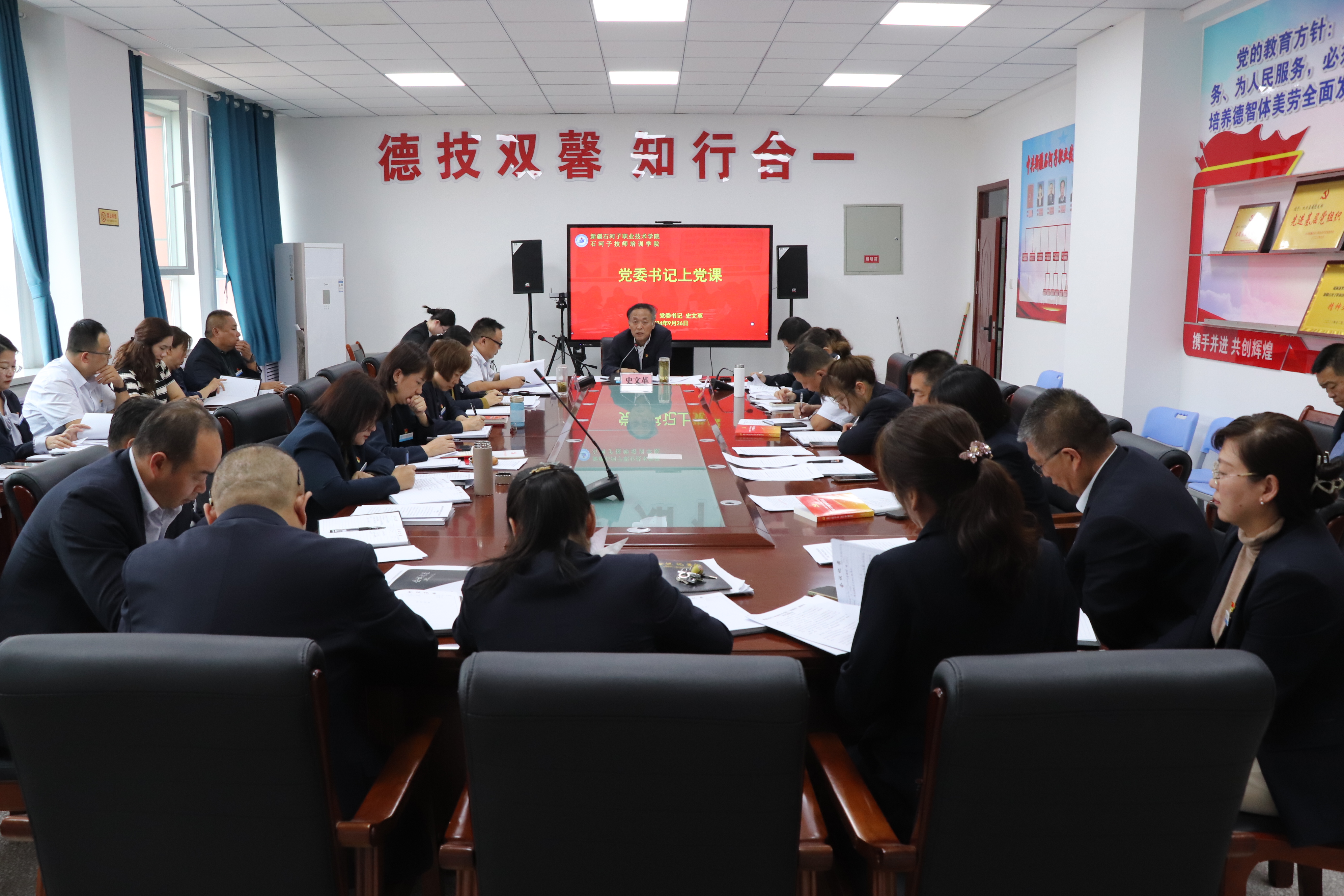 (王需 杨慧 报道)2024年9月26日,Beat365中文官方网站党委书记史文革以《新时代“三全育人”全面提升立德树人成效》为题,在厚德楼二楼会议室讲授党课,学院党委、各部门负责人,各二级学院书记、院长参加聆听了党课。