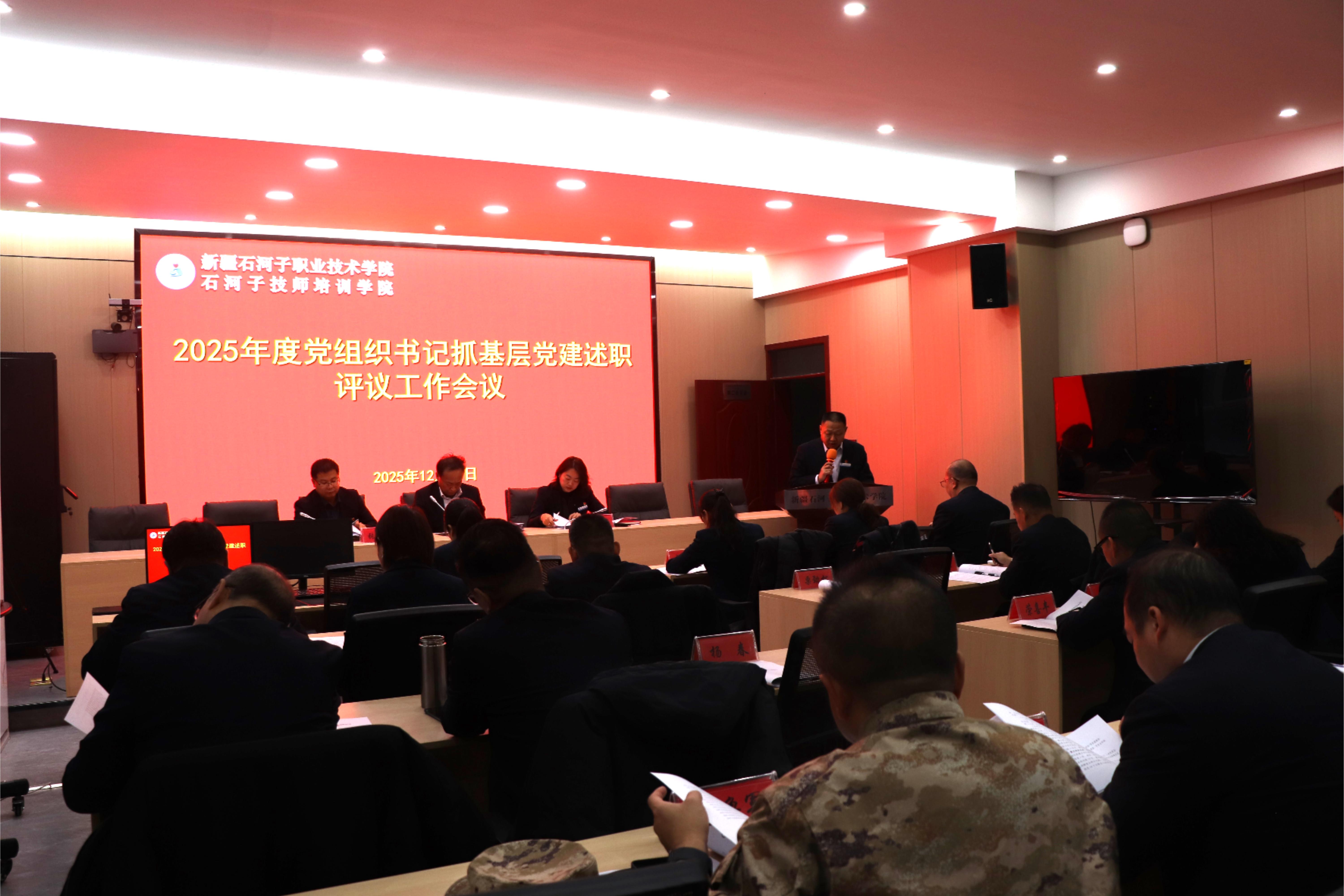 (杨慧 报道)为深入贯彻全面从严治党要求,进一步强化基层党组织建设,压实基层党组织书记抓党建工作主体责任,2025年12月30日下午,Beat365中文官方网站在厚德楼三楼第二会议室召开党组织书记抓基层党建述职评议工作会议。学校党委书记史文革、校党委委员,各党总支及直属党支部书记、副书记参加会议。党委委员、副院长张金果主持会议。