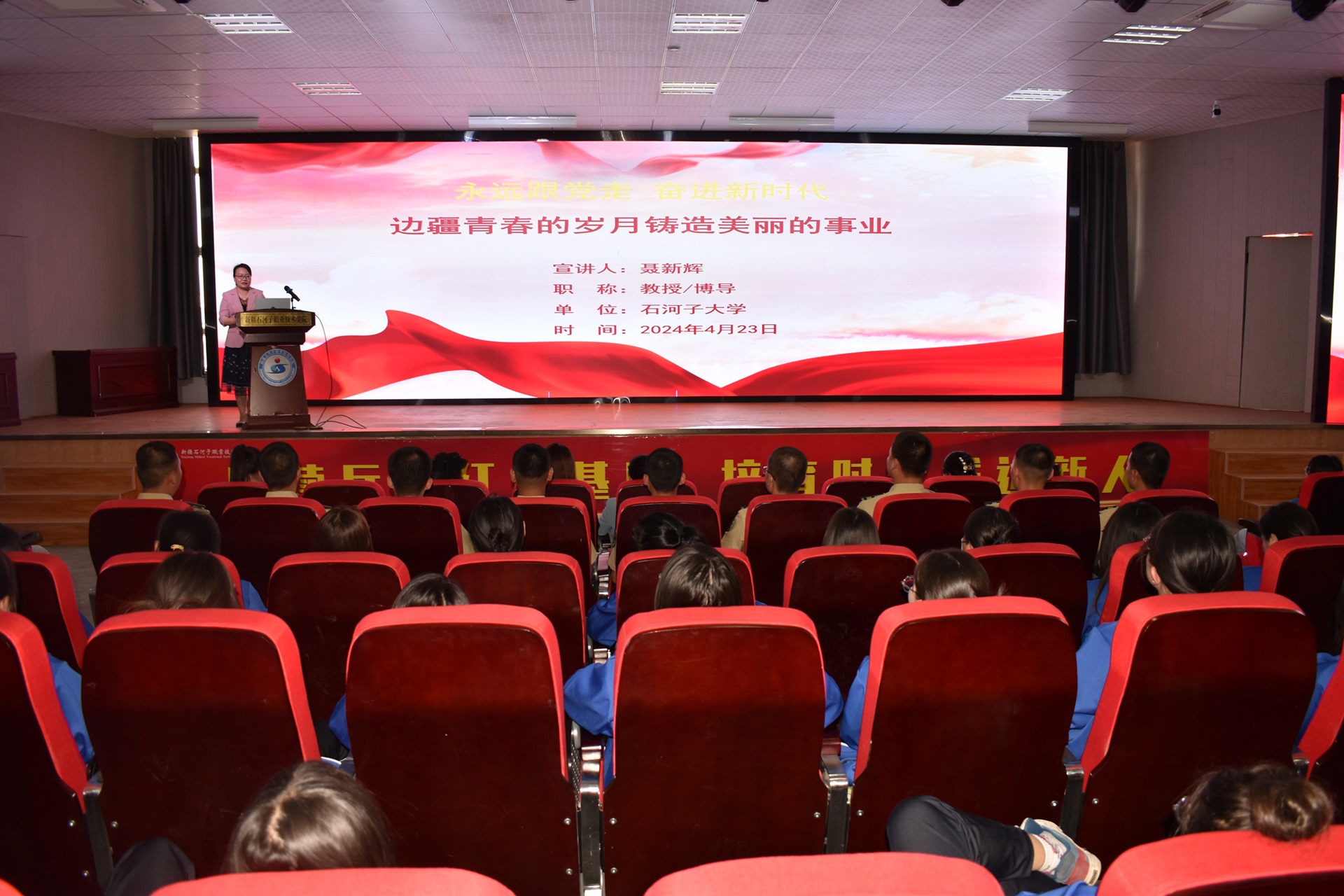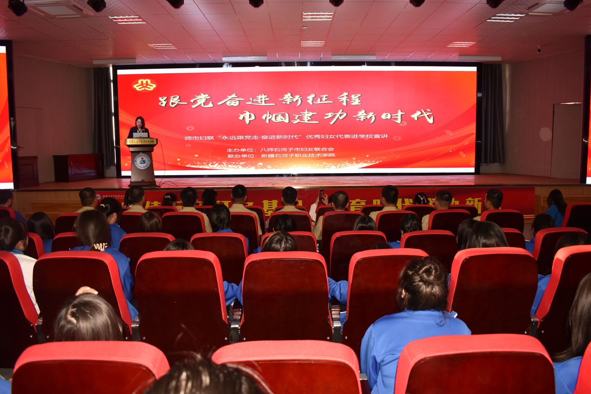(石妍 报道)2024年4月23日,师市妇联“永远跟党走 奋进新时代”优秀妇女代表在学院行政南附楼301阶教开展进高校宣讲活动。师市妇联党组书记、主席杨玲,学院工会主席、副院长马彩梅,学院工会、女工委相关人员参加活动,近400名学生代表现场聆听宣讲报告。