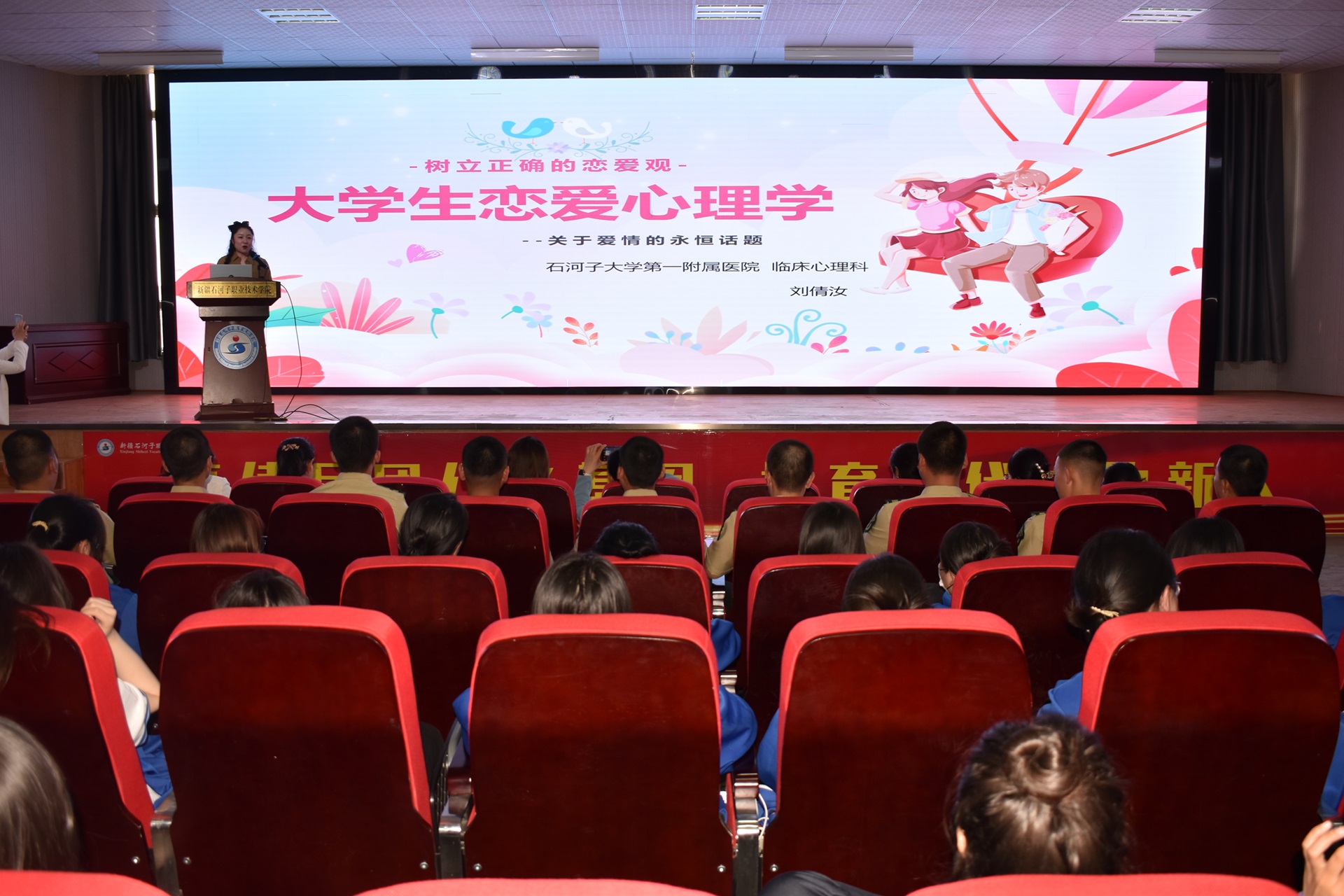 宣讲活动中,三位宣讲嘉宾从女性视角出发,阐释工作中保持积极健康心态的方式方法。孔令媛院长以“初心”为主题,结合工作经历,讲述了自己对养老事业的热爱、坚持和奉献;聂新辉教授分享了她在教师岗位潜心教书育人,践行“扎根兵团、服务兵团”的历程;刘倩汝医生以学生的视角,讲述如何自我保护、如何完善人格、如何处理异性交往关系方面的知识,引导学生树立正确的恋爱观。