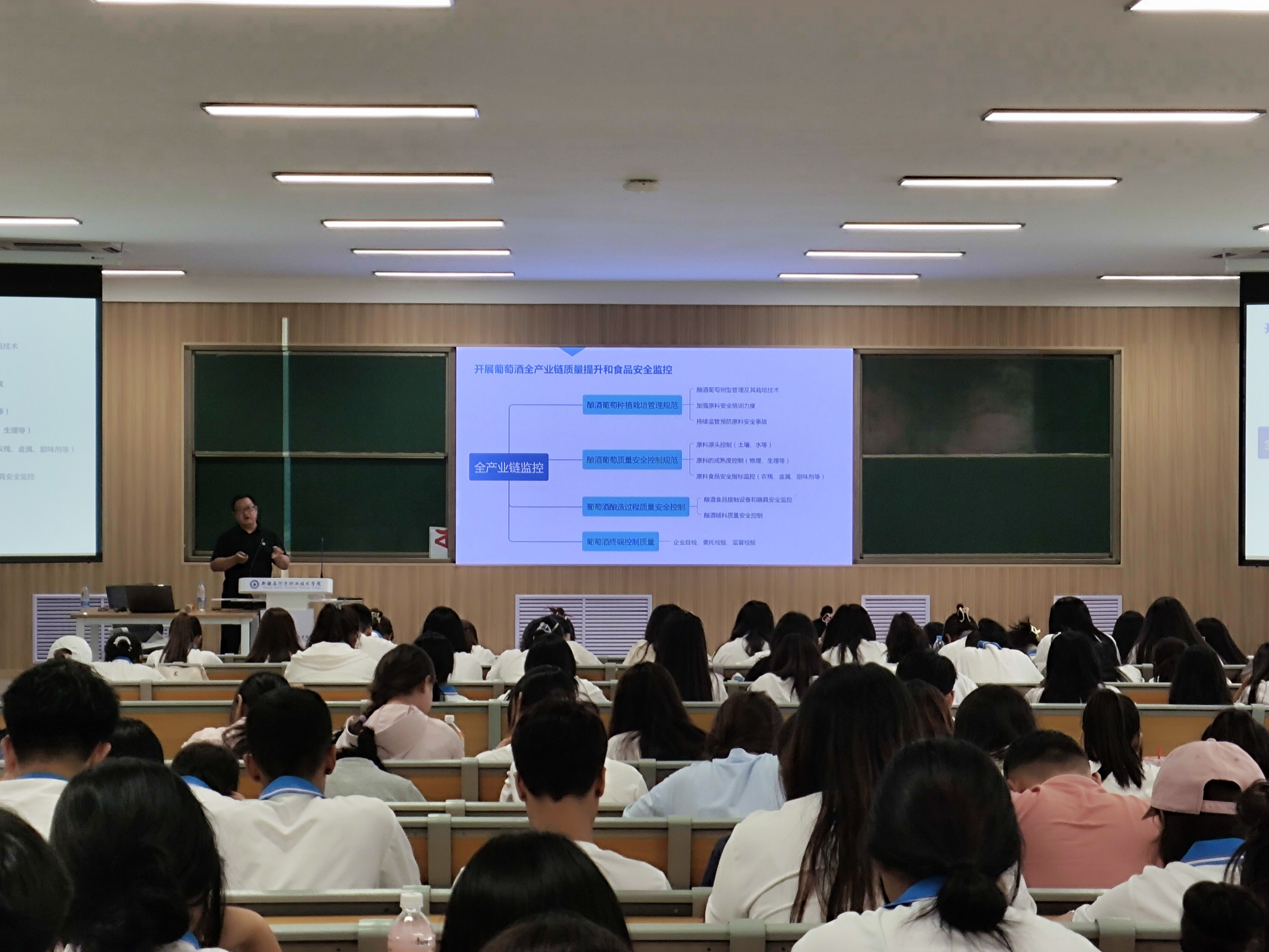 在讲座期间,谈明东总经理从葡萄酒质量安全体系的建构和数据库的建设、葡萄酒品质全流程的提升以及研究性探索三个方面阐述了葡萄酒全流程质量安全措施。涵盖了从原料采购到最终产品储存和运输的各个环节,旨在确保葡萄酒的质量和安全,保障消费者的健康,更迭到行业发展。此外并分享近几年来企业在质量提升方面获得的颇多成果,强调只有掌握扎实的技能和过硬的本领才是个人乃至企业发展真正的法宝,鼓励同学们认真进行职业规划,努力成为一名高素质、高技能人才。