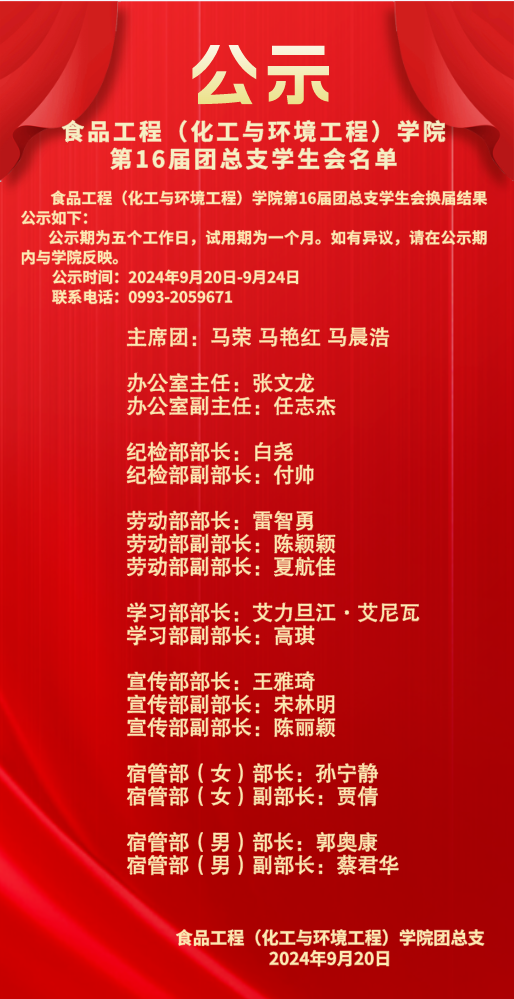食品工程(化工与环境工程)学院第16届团总支学生会换届结果公示如下: