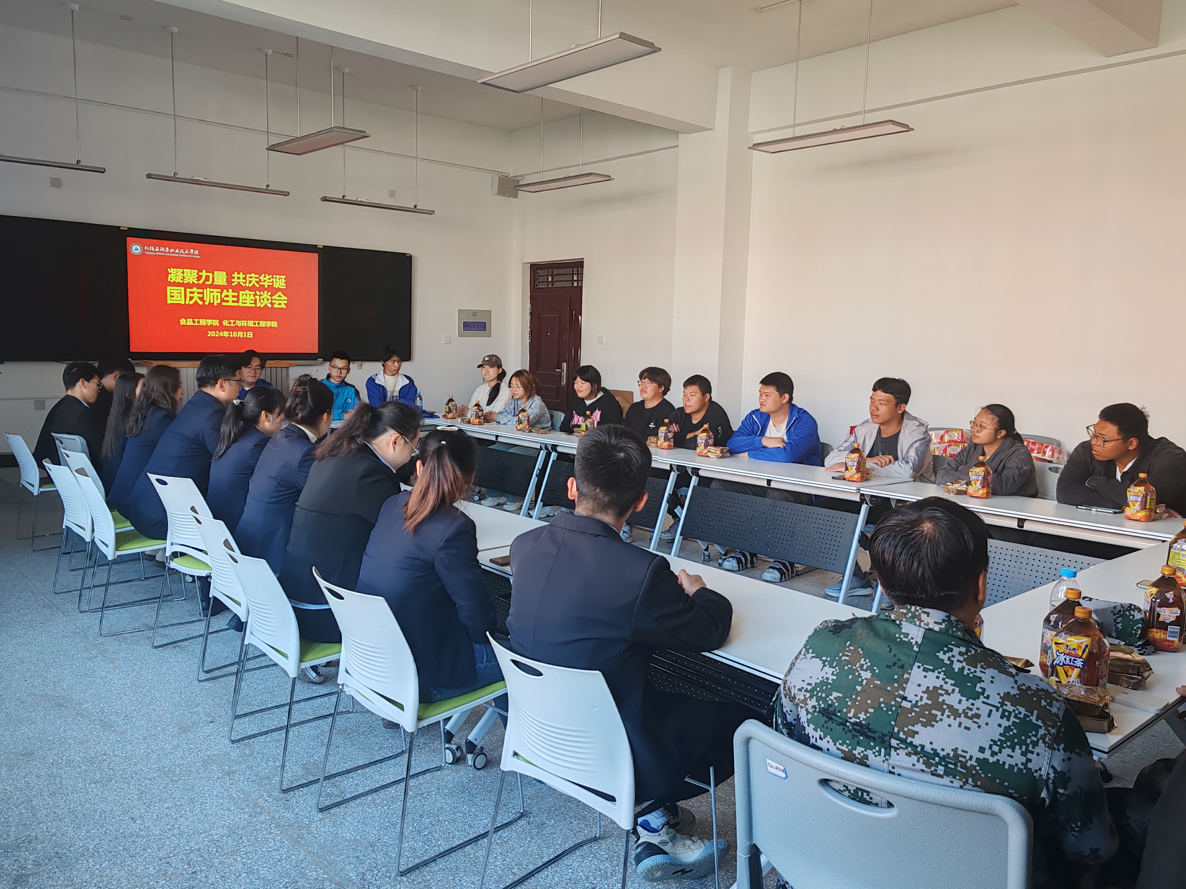 为庆祝中华人民共和国成立75周年,进一步增强师生对党和国家的热爱之情,加强师生之间的交流与沟通。2024年10月1日,食品工程学院(化工与环境工程学院)在鸿智楼B105开展了“与国同庆,薪火相传”师生座谈会,师生携手喜迎国庆。学院领导、教师及留校学生代表参加了本次座谈会。