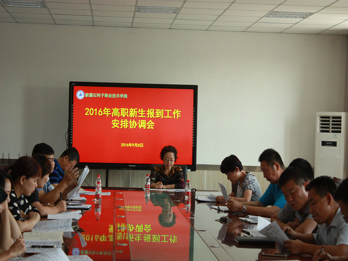 招办主任宫崇勇宣读了《2016年高职新生报道工作安排》,就新生接待安保与车辆安排、新生入学宿舍安排、后勤服务、新生费用收缴等工作做了通报与说明。