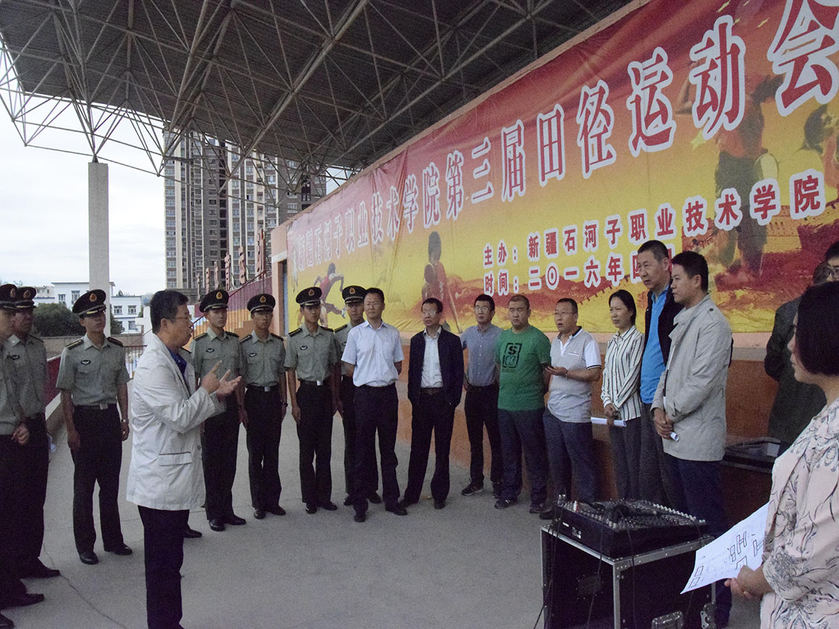 学院副院长王华东、石河子大学国防生选培办干事曹冠平、学院机电分院书记胡英、水建分院书记李卫、轻工分院书记李芳、信息分院书记朱卫泉、经贸分院院长栗劲松,45名军训教官,新生班主任及2700余名高职新生参加了动员大会,大会由学工处副处长陈峻主持。