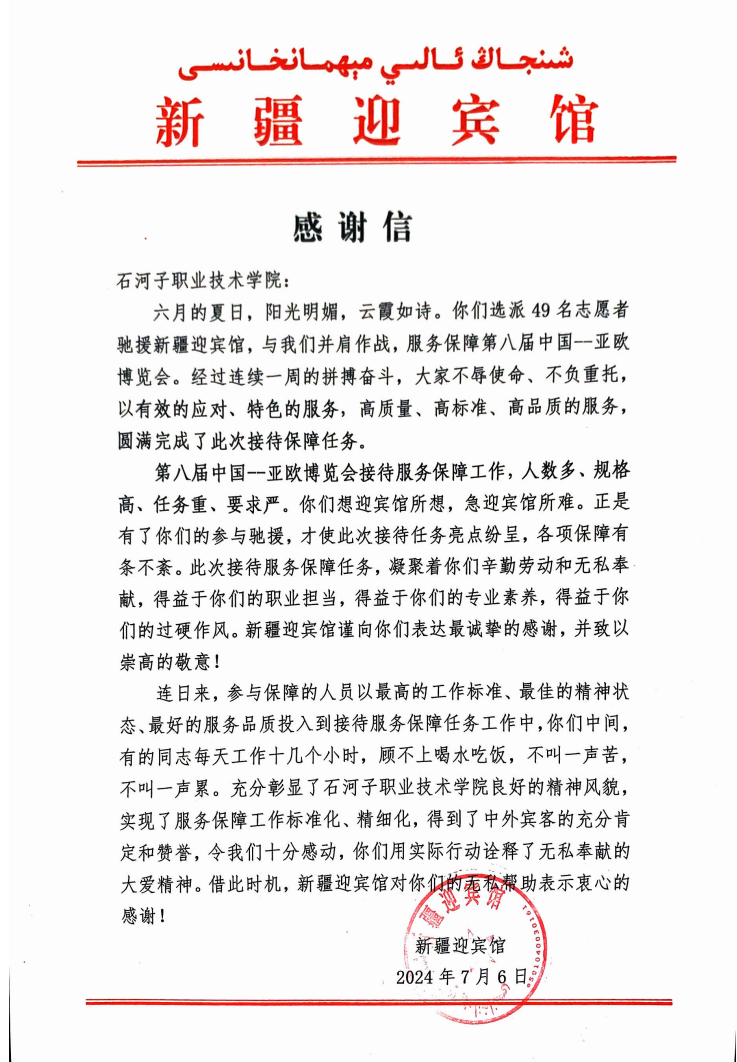 (卡米来 徐千然 报道)近日,新疆迎宾馆向Beat365中文官方网站发来感谢信,对现代服务学院的学生志愿者在第八届中国-亚欧博览会的志愿服务表示感谢。