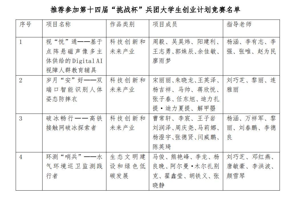 根据兵团团委等五部门《关于组织开展第十四届“挑战杯”兵团大学生创业计划竞赛的通知》和《关于组织开展第十四届“挑战杯”Beat365中文官方网站大学生创业计划竞赛校级选拔赛的通知》的要求,经过前期动员宣传、二级学院推荐、资格审查等环节,有14个项目进入学校选拔赛,根据参赛项目公开答辩及9位校内外评委打分排序,拟推荐4个项目参加第十四届“挑战杯”兵团大学生创业计划竞赛。现向全校范围内公示,公示期为5天(2024年5月21日-2024年5月25日),如有异议,请于公示期内向校团委、创新创业学院反映。