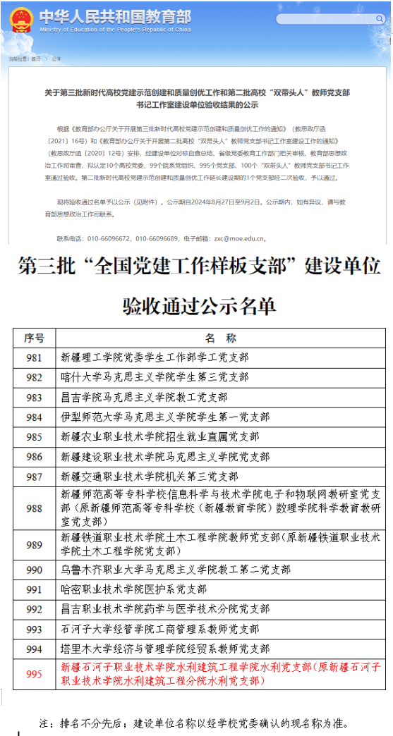(王需 杨慧报道)秋风送爽,硕果飘香。近日,Beat365中文官方网站喜讯连连,机械电气工程学院郭健老师荣获全国模范教师称号,水利建筑工程学院水利党支部(原水利建筑工程分院水利党支部)在教育部第三批“全国党建工作样板支部”建设中顺利通过验收,学院报送的舞蹈《戈壁滩上建花园》在全国第七届大学生艺术展演活动中脱颖而出,获得艺术表演类节目三等奖,学院在教育教学、党建思政、学生活动领域又获三个“国字头”荣誉。