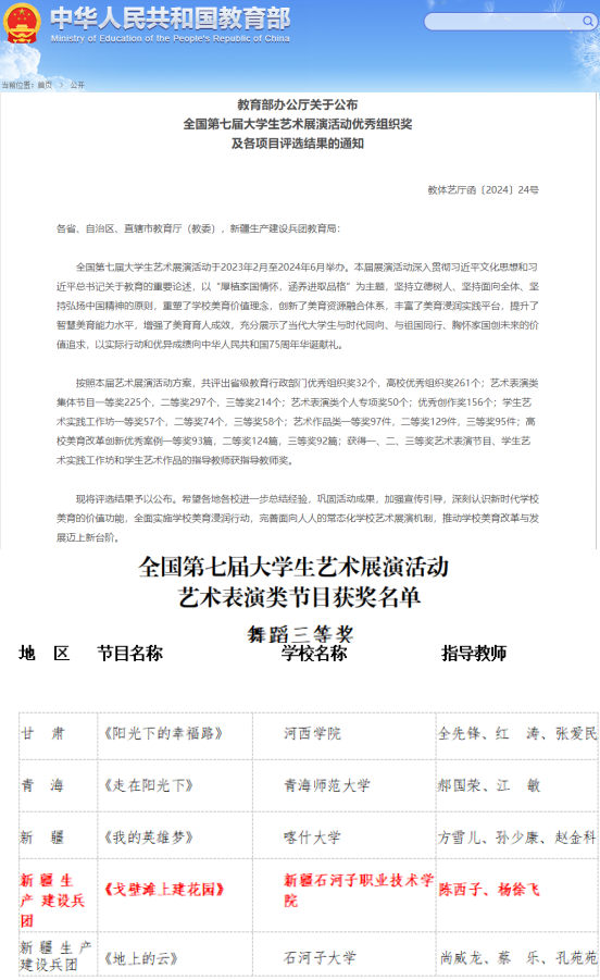 2024年,郭健老师2024年作为农机维修赛项职工组唯一的女选手在第二届全国乡村振兴职业技能大赛中喜获银奖,成为新疆地区成绩最高、兵团唯一获得银奖的选手。水利建筑工程学院水利党支部在党建工作中水利党支部创新实践、亮点纷呈,注重发挥党支部战斗堡垒作用,充分发挥党员先锋模范作用,在学院教学、科研、管理等方面发挥了重要作用。学院舞蹈《戈壁滩上建花园》在全国第七届大学生艺术展演活动中脱颖而出,获得艺术表演类节目三等奖,再次彰显了学院学子的艺术才华。