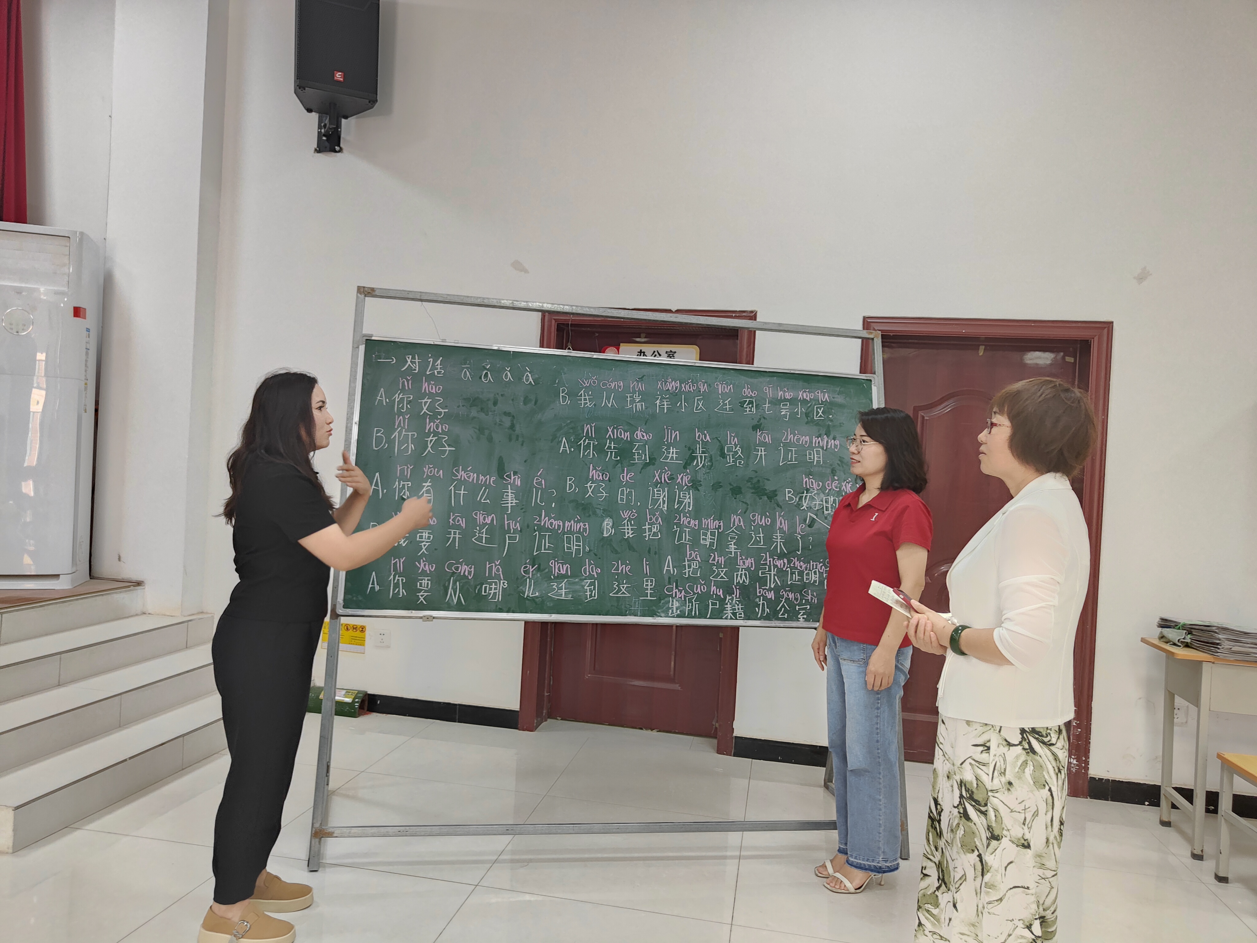 双向沟通打破“心墙”,共营和谐教学氛围。8月26日,吴晓晖一行走进皮山农场五连夜校,深入五连夜校职工国家通用语言培训课堂,与连队领导班子以及当地工作组进行面对面沟通交流,了解夜校当前的教学进度、语音面貌基础、课堂教学方式等基本状况,为培训工作的开展打好坚实基础。学院语委办副主任、食品工程学院副书记李芳当场进行了教学示范,紧密围绕职工群众需求,以问题目标为导向,通过精准发音、带读跟读、互相检查等训练方式,帮助学员熟练掌握国家通用语言文字音节构成和表达技巧,讲授内容清晰明了,语言通俗易懂,整个课堂气氛非常活跃。