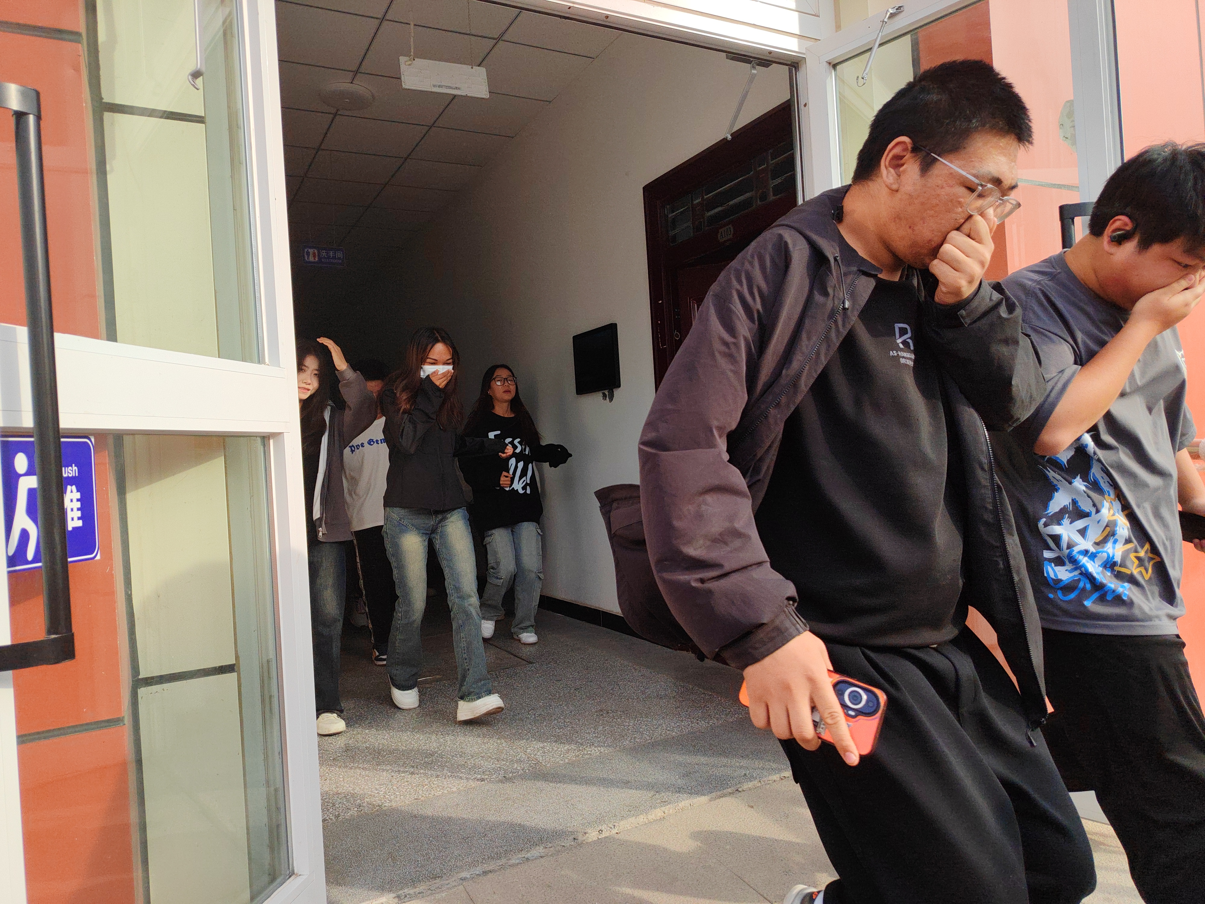 (方然 报道)为提升学生消防安全意识和应对突发事件的处理能力,水利建筑工程学院于2024年10月11日下午在通智楼举行了地震应急疏散演练和消防演练活动,共计400余名师生参加活动。