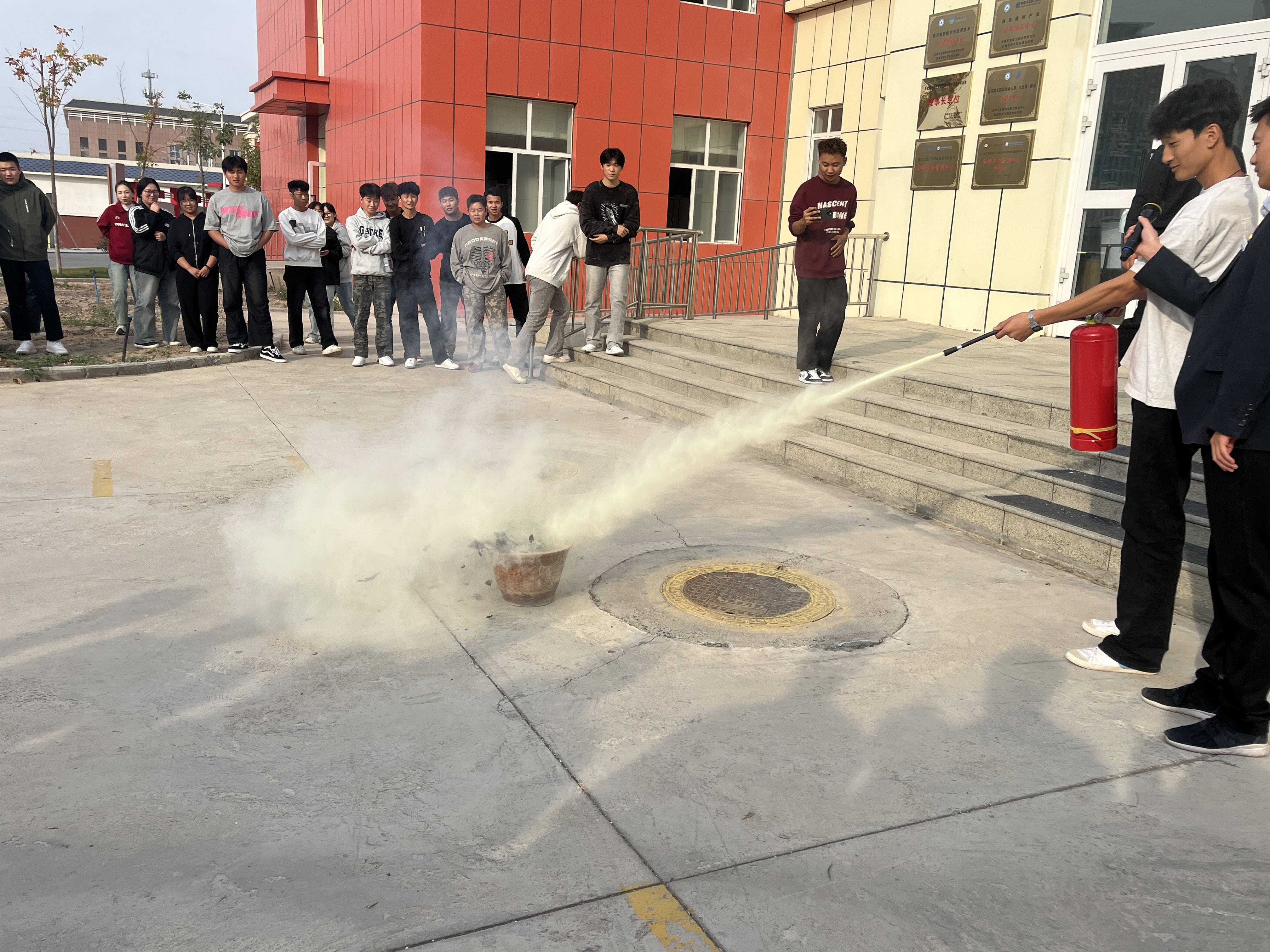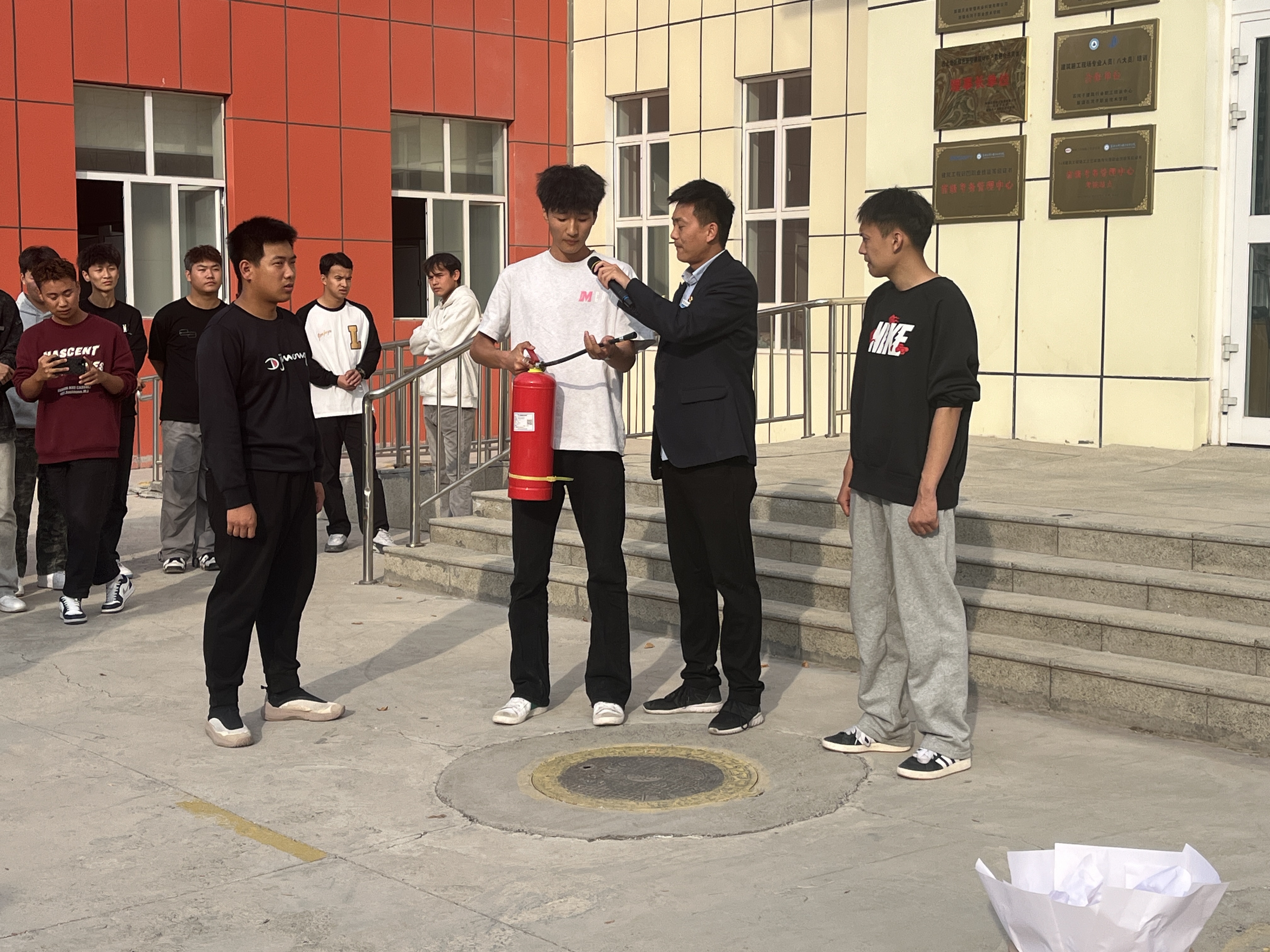 当日下午17点整,一阵嘹亮急促的警报声响起,学生们迅速响应,用手捂住口鼻、弯腰前行,护住头部防止坠物伤害,在老师的指挥下,冷静有序迅速按照预定的疏散路线有序撤离,并在指定的安全区域以班级为单位清点人数,整个疏散过程高效流畅,用时不到5分钟,充分展现了学生们的团队协作精神和应急反应能力。在消防演练环节,学生们在学院教师的指导下进行灭火器使用培训,朱秀明老师详细介绍了灭火器的种类、构造,重点强调了灭火的“四步法”:拔保险栓、握紧喷管、对准火源、压下手柄,并演示了灭火器的正确使用步骤。学生们依次上前进行实际操作,使用灭火器扑灭模拟火源,掌握了基本的灭火技能,增强了应对初期火灾的信心。