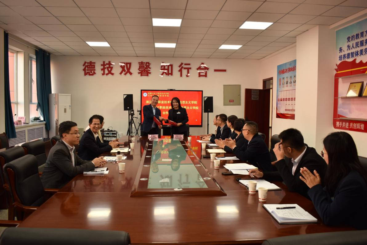 会上,纪委书记万祥军介绍了学院的基本情况,施云平书记和张敏院长分别分享了学科建设、青年教师培养、实践教学创新、科研成果以及“大思政”课育人新格局方面的做法与成效,在与会人员的共同见证下,两校签署了马克思主义学院合作协议,使两校间的合作迈向了新的高度。浙江建设职业技术学院马克思主义学院领导一行参观了铸牢中华民族共同体意识基地、爱国主义教育基地、种德育人实践基地和创新创业基地,张敏院长结合学院大思政建设,详细介绍了学院将爱国主义教育和思政教育融入日常工作的方式,领导一行对学院在思政教育方面的成就给予了极高评价。参观结束后,施云平书记和张敏院长希望两校马克思主义学院间的合作,共同推进师资队伍建设、学科建设、科研成果建设,实现资源共享与优势互补的共赢局面,共启高职院校思想政治理论课建设新篇章。