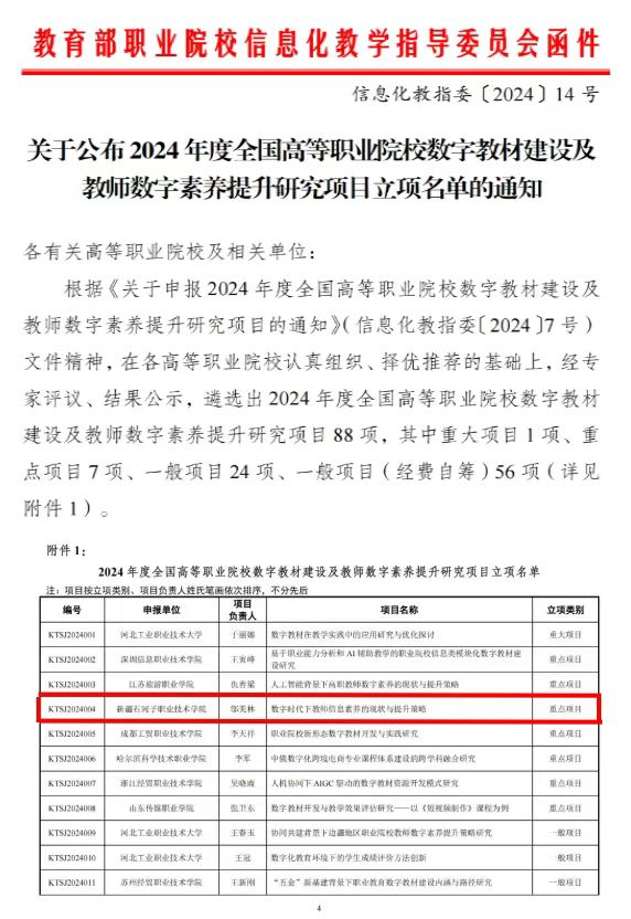 全国高等职业院校数字教材建设及教师数字素养提升研究项目旨在深化职业教育数字化转型研究,以案例为载体推广职业院校数字化转型经验,经过经专家评议、结果公示,遴选出2024年度全国高等职业院校数字教材建设及教师数字素养提升研究项目88项。