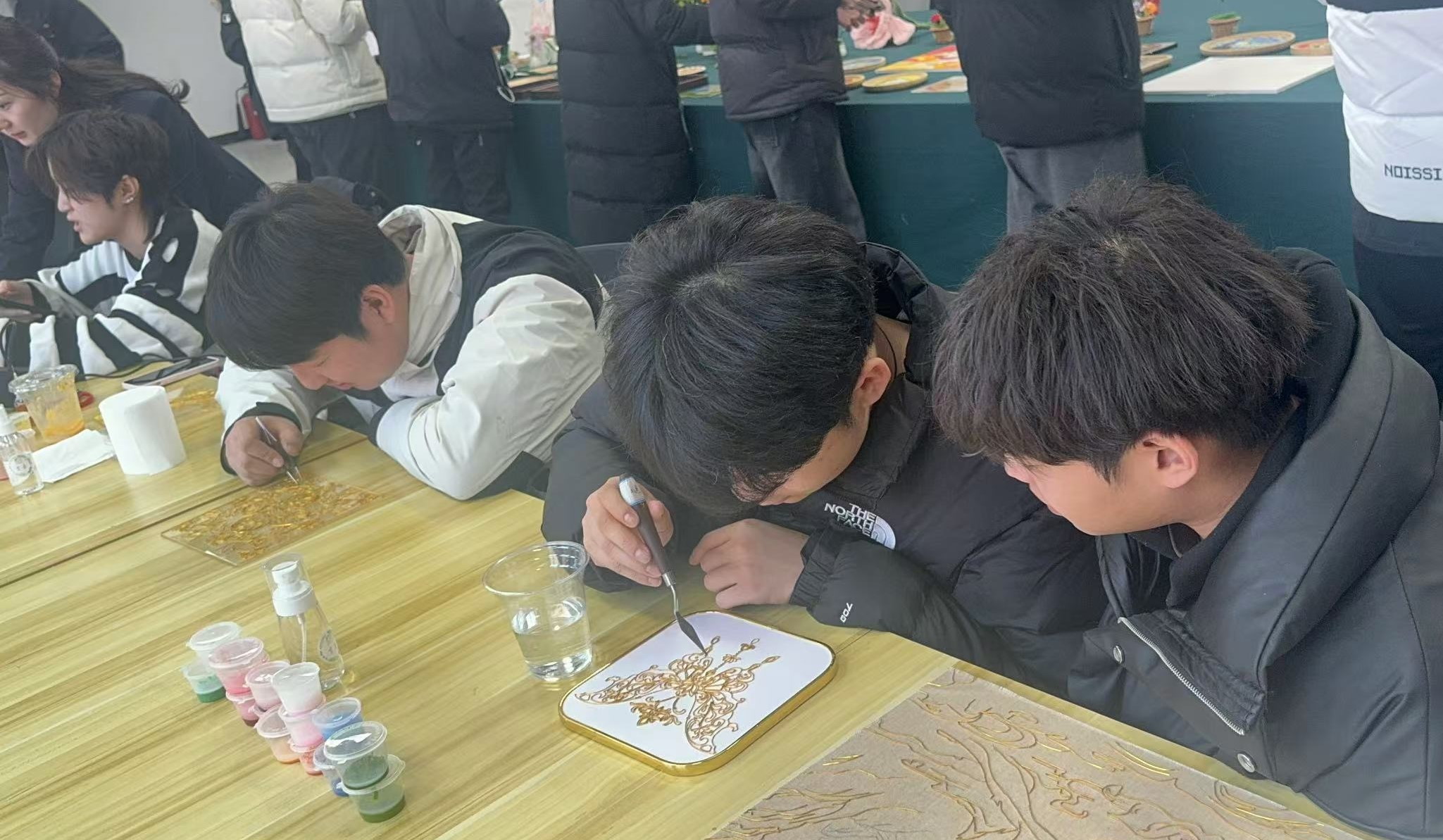 活动现场,非遗工作室陈峙米老师介绍了掐丝彩釉的发展历史、制作过程以及文化价值,现场演示掐丝彩釉复杂细致的制作过程,展示精美绝伦的成品,让同学们对掐丝彩釉有了更加深刻地了解,激发了对这一传统工艺的好奇心和探索欲。大家根据自己的喜好,挑选喜欢的图案开始进行创作。在陈老师的指导下,同学们用柔软的铜丝,掐成相应的花纹胶,聚精会神地将不同颜色的釉料填充在花纹里,完整制作了一幅掐丝珐琅作品,切身感受到了精益求精的工匠精神以及投身劳动的成就感,进一步感悟了优秀传统文化的魅力。