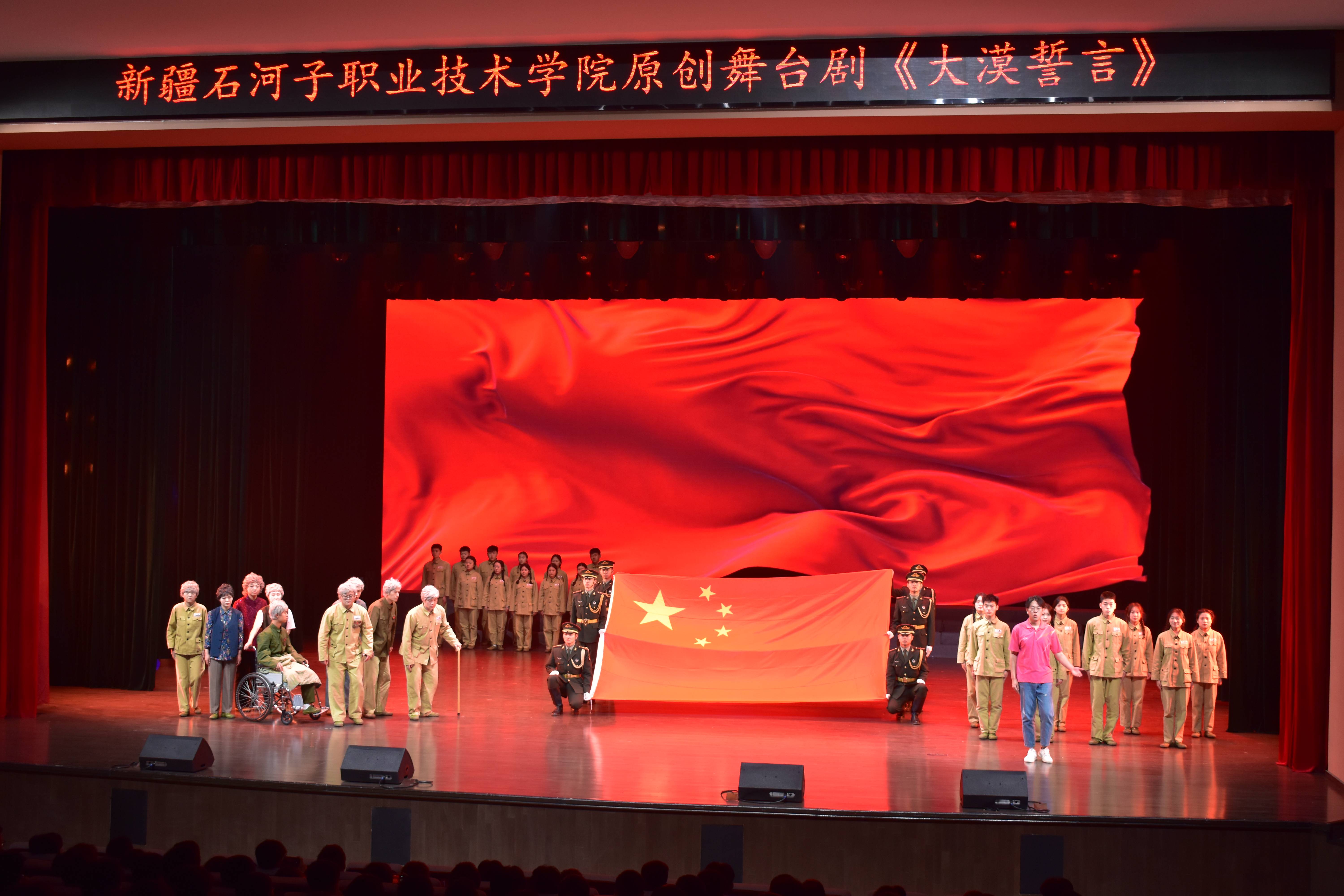 打造思政育人新阵地。立足兵团红色资源和校内红色文化资源,开展思政现场教学、沉浸式情景教学,把兵团精神、胡杨精神、老兵精神等作为“大思政”重要内容,精心编排《大漠誓言》舞台剧并在兵团范围内开展巡演,将兵团精神传承与思想政治教育相结合,让校园成为兵团红色文化的聚集地、共振区和辐射源,让大思政教育可见可感、深入人心,引领学生从红色血脉中汲取力量。