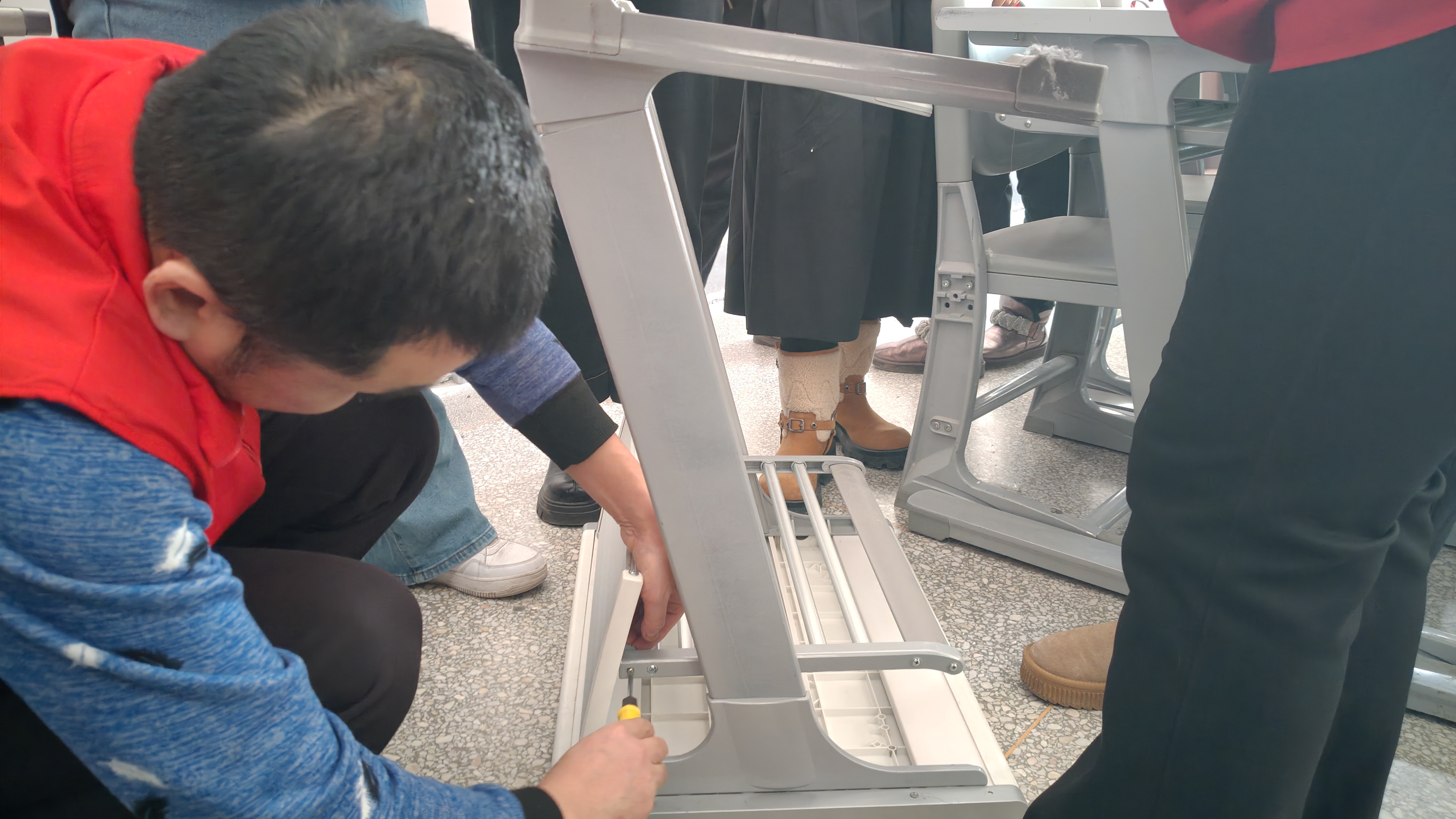 (杨静静 报道)2025年1月3日下午,现代服务学院直属党支部开展主题党日活动,重点维修培智楼内的桌椅,以改善师生的学习和工作环境。
