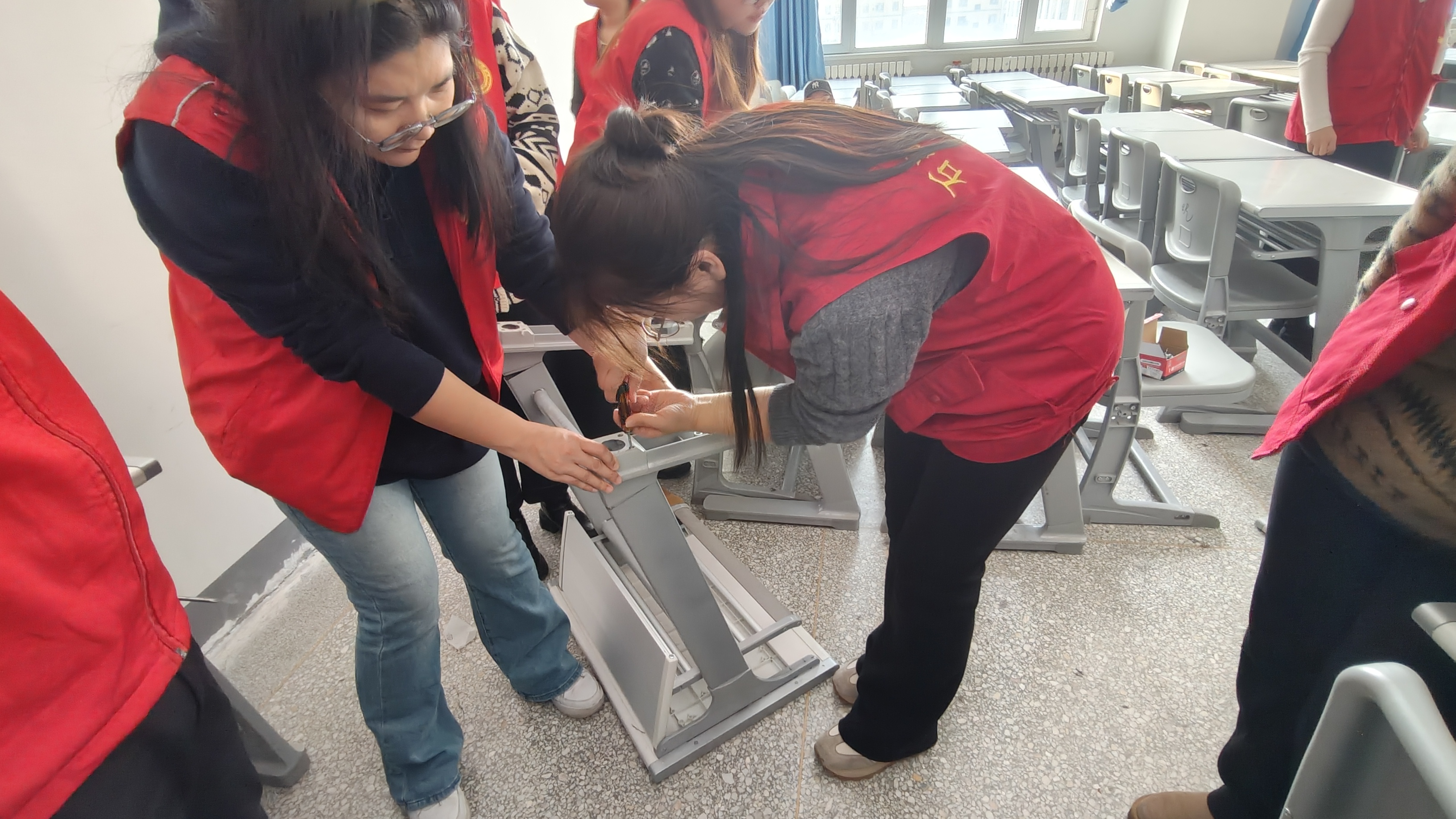 在党支部书记俞峰的带领下,学院全体教师积极响应,与留校志愿者一起参与了此次活动。他们携带各种维修工具,对教学楼内教室和公共区域的桌椅进行了全面检查和维修。在维修过程中,教师们认真细致地检查每一处损坏,无论是松动的螺丝、开裂的桌面还是不稳定的椅子,都一一进行了修复或加固处理。通过他们的努力,许多桌椅焕然一新,极大地改善了校园的硬件设施。