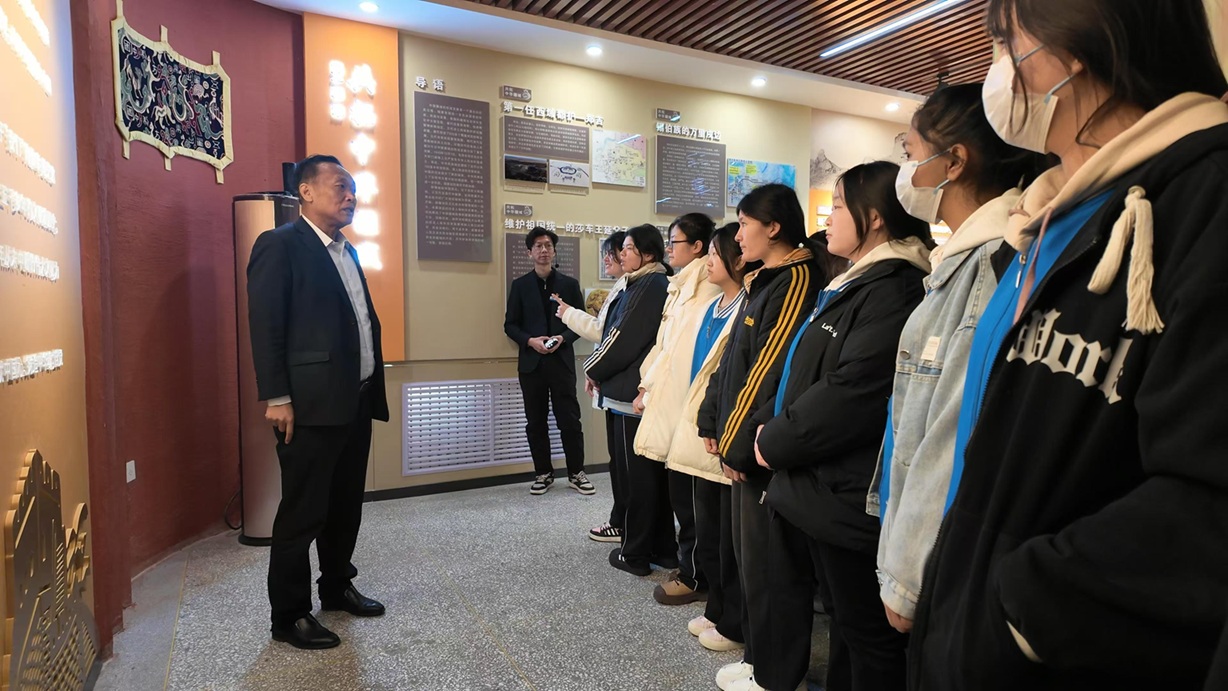 在铸牢中华民族共同体意识展馆,党委书记史文革以“石榴籽”为喻,为学生们解读铸牢中华民族共同体意识内涵,带领学生直观感受中华文化的多元一体,教导同学们要像石榴籽一样紧密团结在一起,将个人理想融入民族复兴伟业。一张张历史照片、一件件纪念性物品、一段段红色影像,使学生们从各民族交融共生的历史画卷中深刻感受到“中华民族一家亲”的深厚力量。
