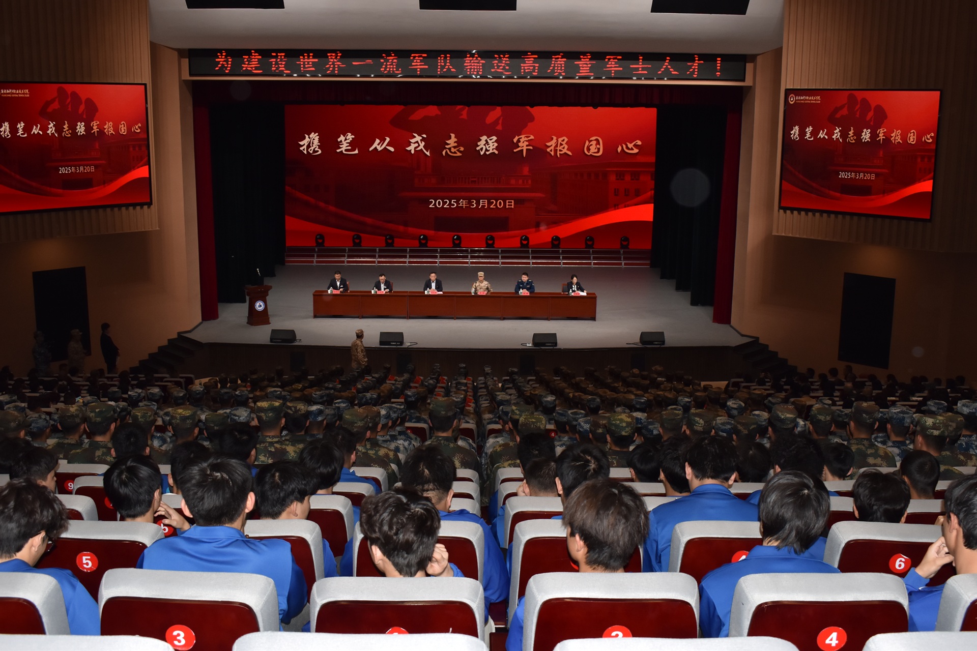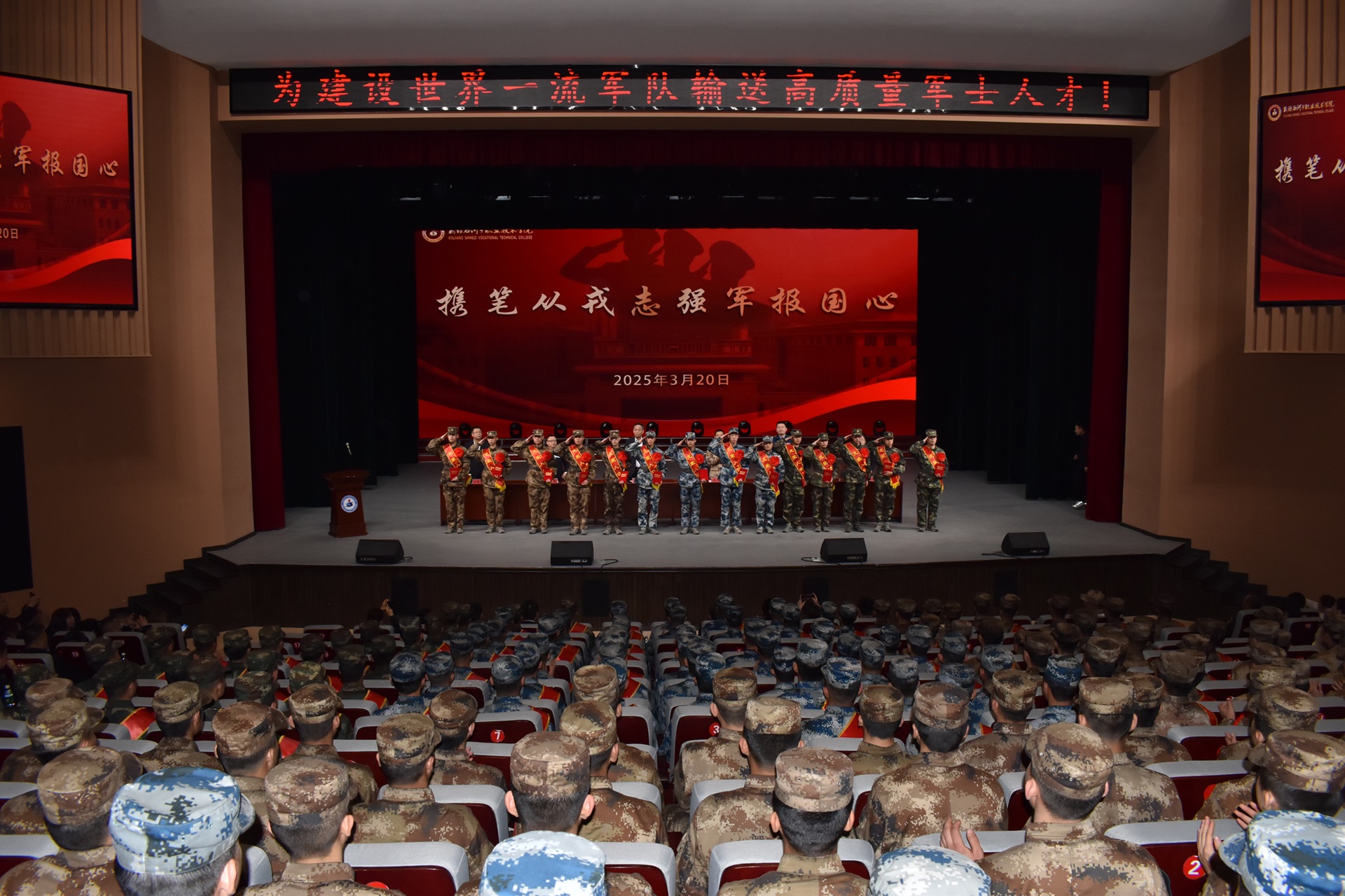 全体军士生身着戎装、胸戴红花,挺立如松,齐声高唱《强军战歌》。嘹亮的歌声穿透报告厅,展现出军人特有的血性与担当。这一刻,从课堂到军营的使命传承清晰可见,从学校到祖国边疆的责任纽带悄然绷紧。