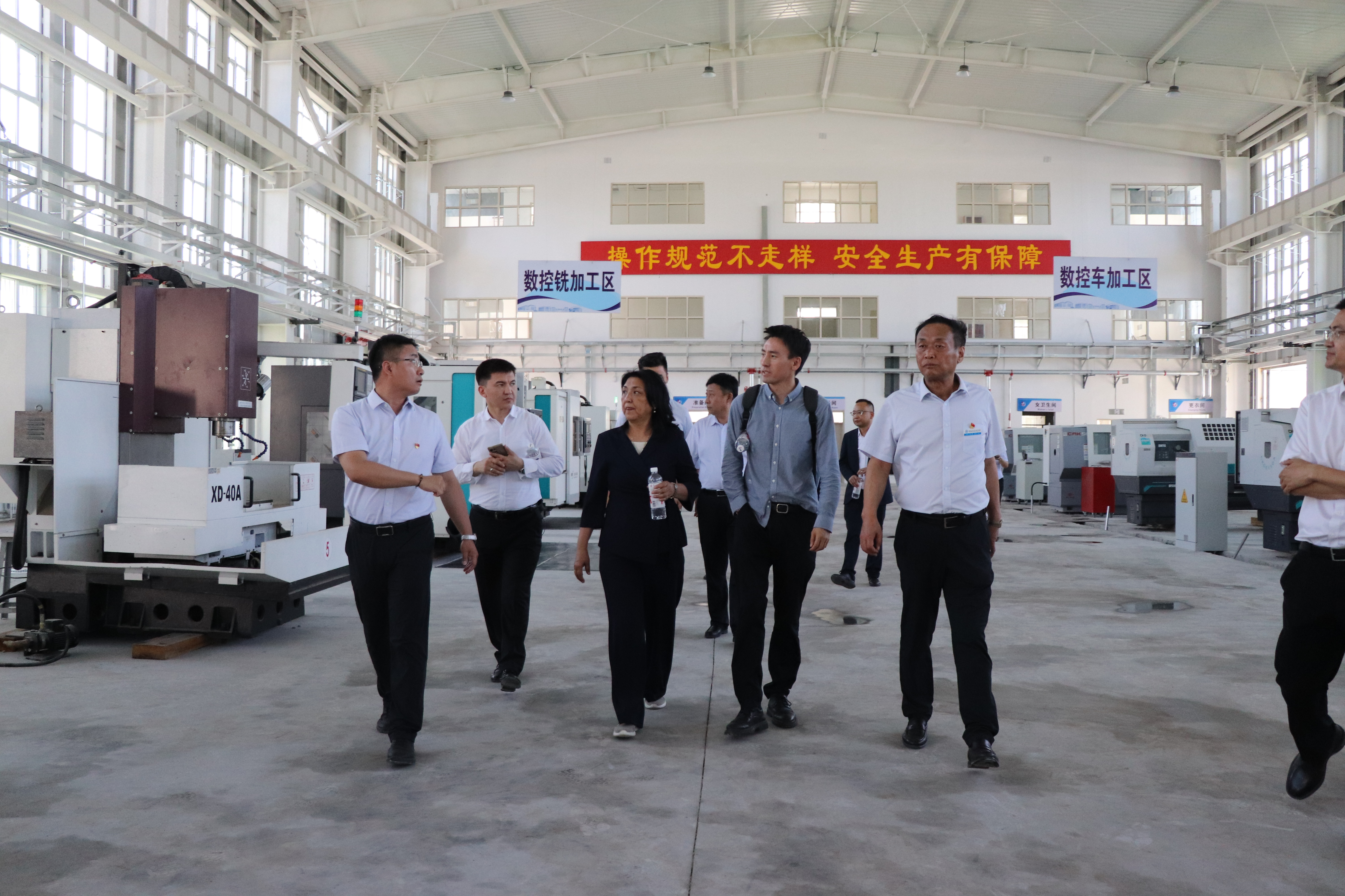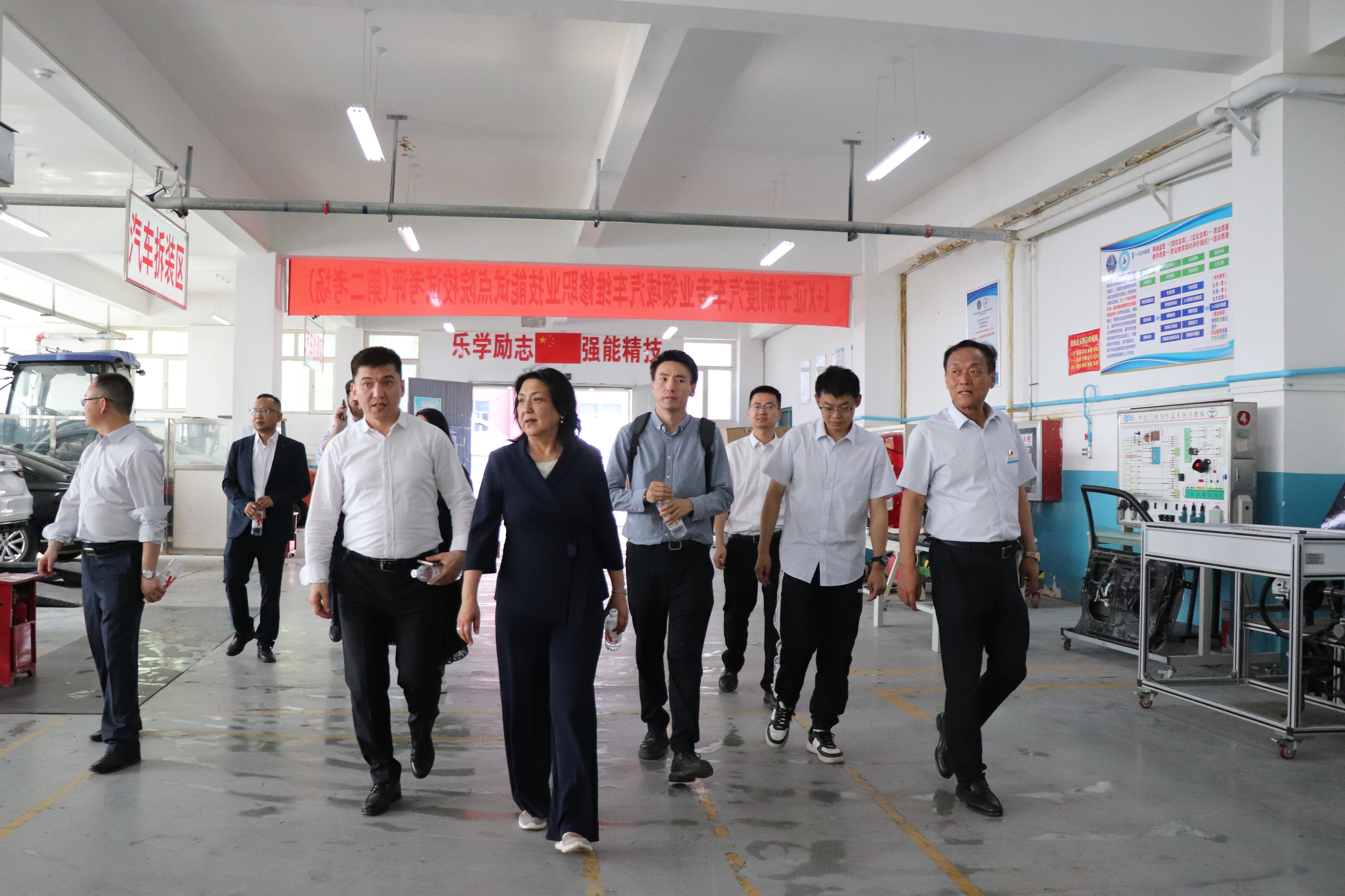 学校党委书记史文革、院长林炯陪同代表团一行先后参观了学校工程实训中心、汽车实训基地、产教融合实践中心等教学实训场所。在工程实训中心,代表团成员近距离观摩了先进的智能制造设备和学生们的实操过程,对学校在工程技术领域的教学实力和实践能力表示高度赞赏;在汽车实训基地,各类新能源汽车教学设备和专业的实训环境,让代表团成员感受到学校在汽车相关专业建设上的前瞻性和专业性;产教融合实践中心里,校企合作的创新成果和学生们的优秀作品,更是引发了代表团成员的浓厚兴趣,他们纷纷驻足交流,详细了解相关情况。“这里的实训环境与产业需求紧密结合,学生能在此学到真正实用的技术,这对我们开展合作很有启发。”吉尔吉斯斯坦国际大学校长参观时赞叹道。