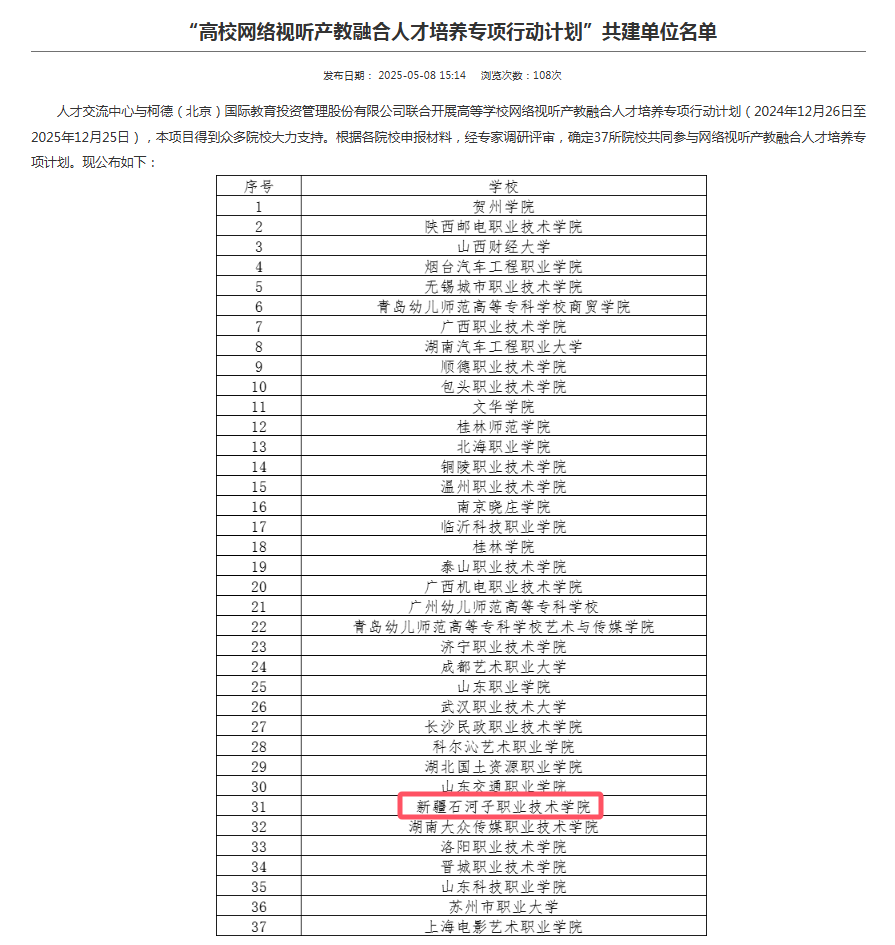 (李玲玲 报道)2025年5月8日,国家广播电视总局广播影视人才交流中心公布了“高校网络视听产教融合人才培养专项行动计划”共建单位名单,Beat365中文官方网站从全国众多申报高校中脱颖而出,成为全国37所入选高校之一,是自治区、兵团唯一一所入选高校。
