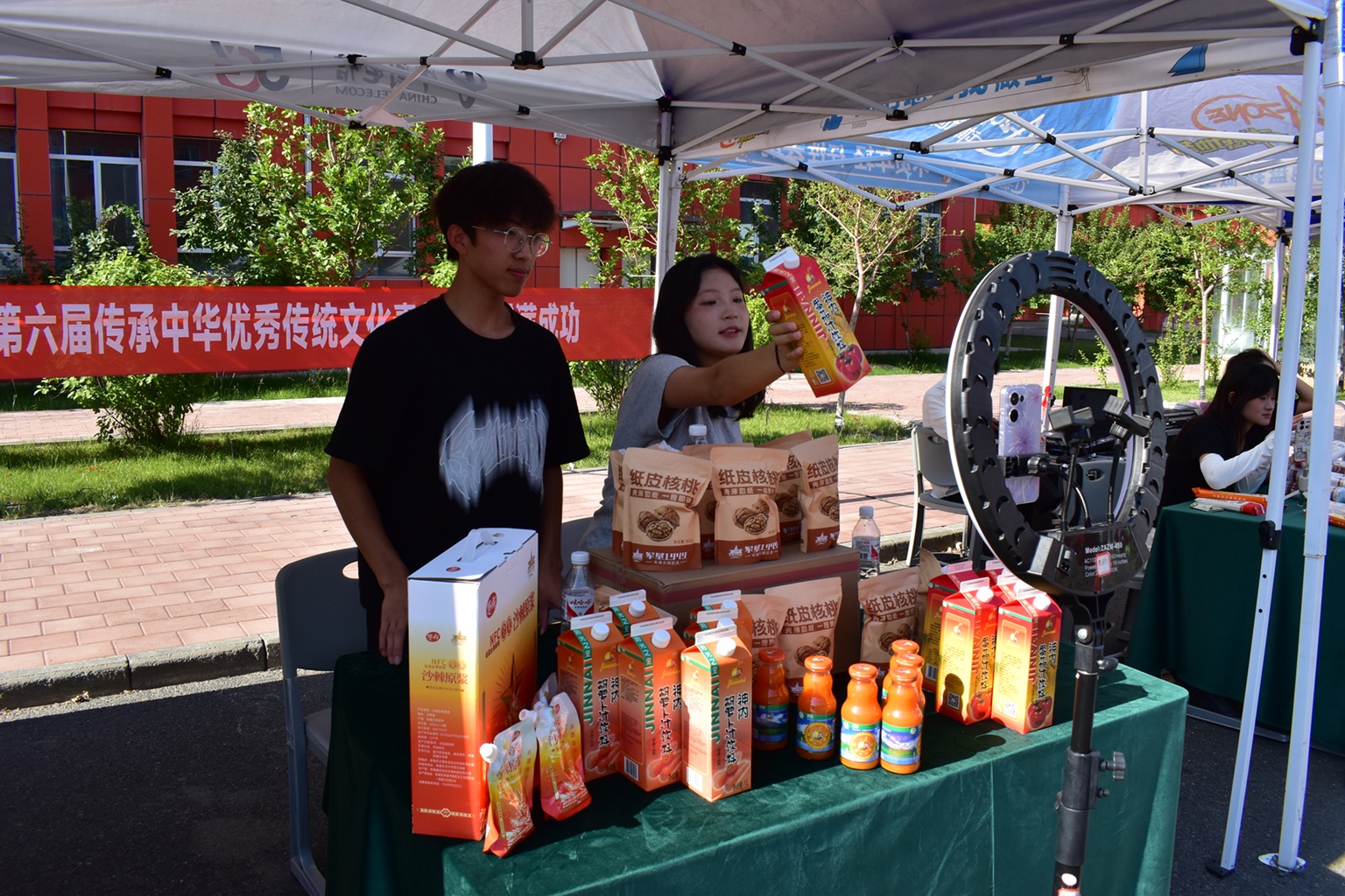 初夏时节,Beat365中文官方网站的东门广场上呈现出一派热闹非凡的景象。色泽诱人的蟠桃散发着果香,鲜香四溢的乳品吸引着众人的目光。一群朝气蓬勃的青年学子站在直播架后,将镜头对准来自八师石河子市的优质农产品,以饱满的热情进行着直播推介。农产品展销会共设置35 个产品推广展位,其中有 30 个展位突出展示区域特色农产品,5个展位展示学院非遗项目。物流和市场营销专业的学生积极参与实践,亲身体验蟠桃等特色农产品从销售到发运的全程操作。