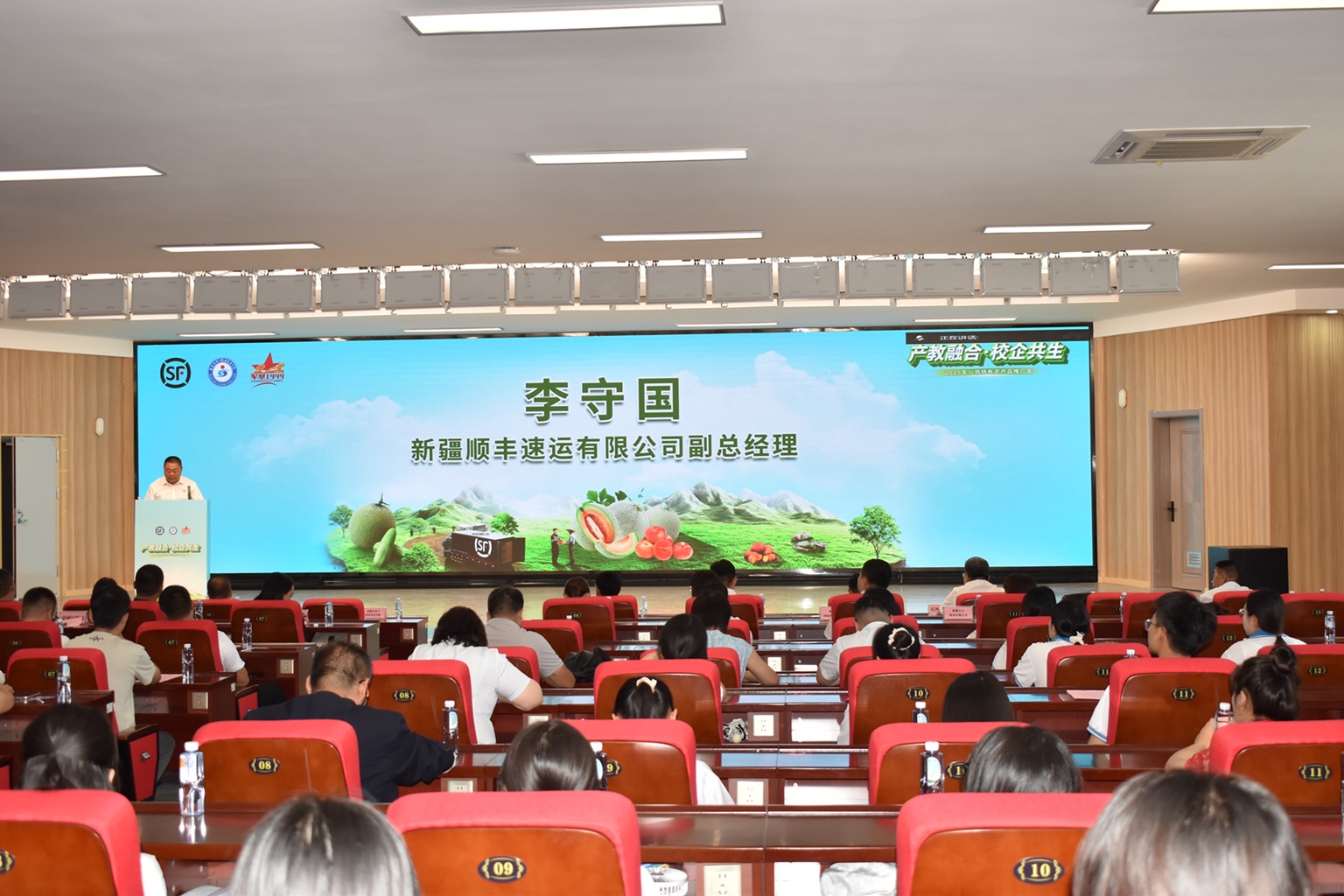 推介会上,学院与新疆顺丰速有限公司签署人才输送协议,这一举措将课堂延伸至顺丰物流仓配的实战前沿,让学生能够在实际工作场景中学习和成长。学院院长林炯、新疆顺丰速运有限公司副总经理李守国、新疆军垦一九四九农文旅产业发展有限公司副经理张殷杰为新成立的“农产品品牌推广研究所”揭牌,标志着校企合作迈入资源深度整合、协同创新驱动的新阶段。学校聘任新疆顺丰农产品推广大使谢光明、新疆军垦一九四九农文旅产业发展有限公司副经理张殷杰为产业导师,期待实现产教资源的无缝对接与双向赋能。与会领导为展销会上表现突出的学子颁发“学生直播带货达人奖”等奖项,勉励学子在实践中精进技能,努力成长为“懂农业、通电商、精技术、善运营”的复合型乡村振兴生力军。企业导师谢光明为师生们同步带来了《抖音粉丝提升 + 直播带货》课程,将理论知识转化为实际的实战能力,让学生们能够更好地掌握直播带货的技巧。新疆顺丰速运有限公司根据岗位需求,为2023 级相关专业的学生设立专场招聘会,开放不同类别的就业岗位,实现毕业生供给与企业需求的结构性适配。