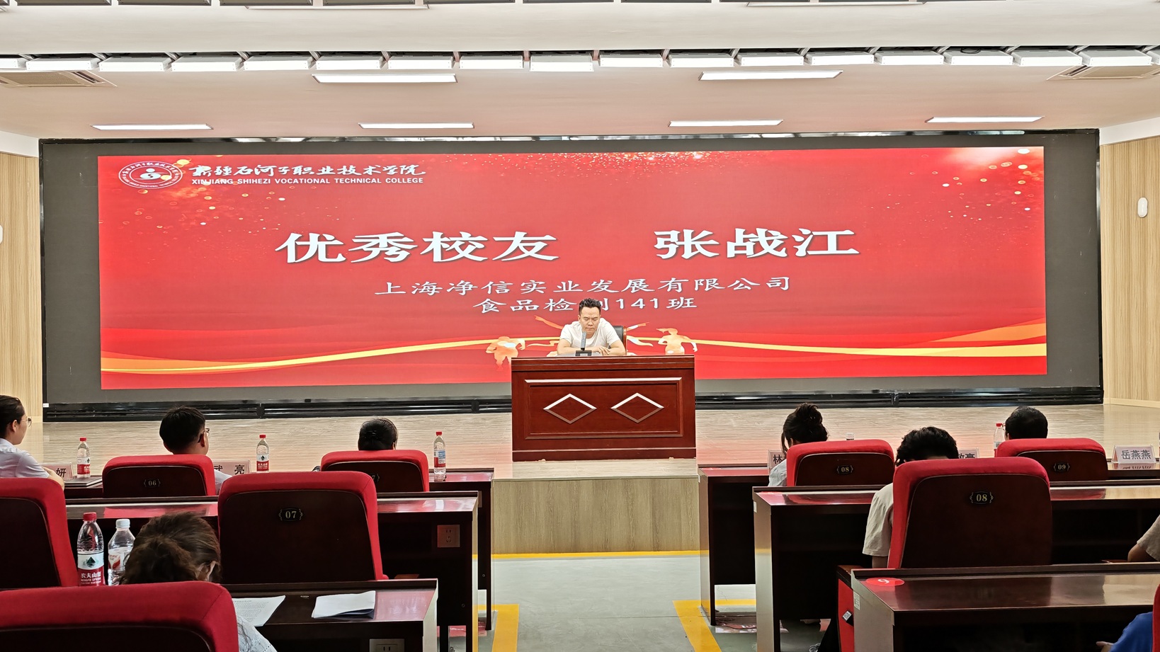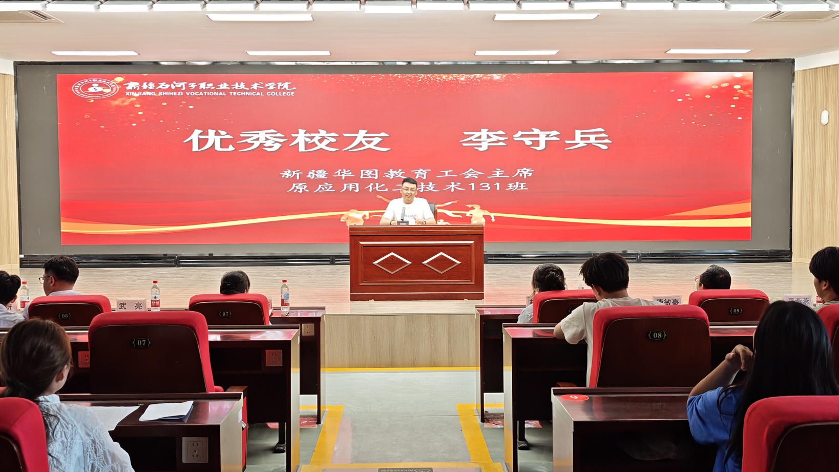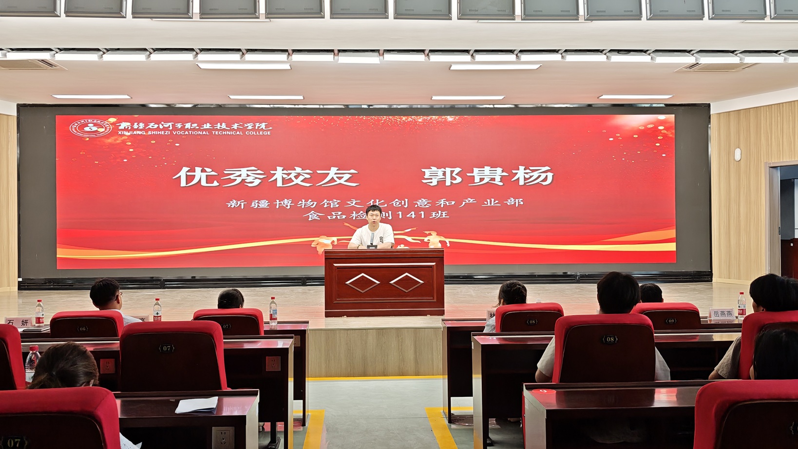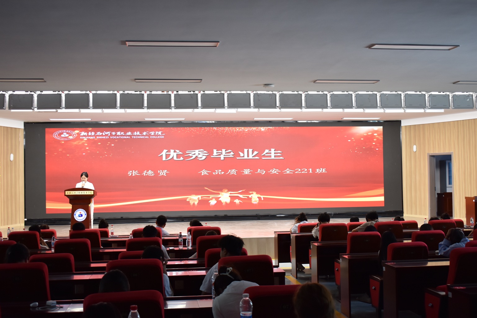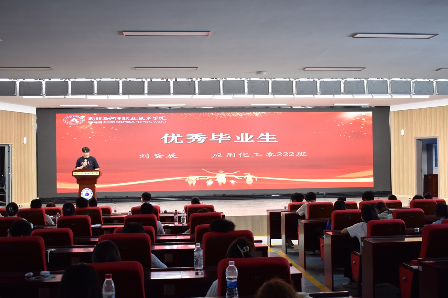优秀毕业生代表分享了自己的奋斗心声。“高中毕业工作四年以后,决心要重塑人生轨迹,以社会考生的身份紧握着录取书走进校园。在母校提供的广阔平台上,我通过参加各类专业实践活动、考取专业相关的技能证书,不断提升专业水平,增强实践能力,有了迈向未来职业生涯的底气。”旅游管理专业221班赵海洋眼含泪水倾情讲述自己从学历提升到技能突破的奋斗历程,生动展现了学子对工匠精神的追求与扎根岗位、服务社会的责任感。作为护理专业首届毕业生,护理222班张衡源满怀热枕,庄严宣誓“当我在急救实训中成功实施心肺复苏时,深感‘白衣’所系的责任。我将以所学守护生命,传递南丁格尔之灯,照亮更多需要帮助的人。”优秀毕业生刘釜辰讲述了自己在专业学习和社会实践中惟以勤勉,不断提升能力坚定信心的心路历程。张德贤同学分享了自己凭借不懈努力和对项目的深入钻研,在中国大学生“互联网+”创新创业大赛中获得二等奖的奋斗故事,表示自己将继续保持求知若渴的进取之心,在持续精进的人生旅途中行稳致远。三位优秀校友代表深情回顾了在校期间参与专业实训和社会实践活动的难忘经历,结合自身岗位职能,分别阐述了专业技能对职业发展的关键作用,寄语学弟学妹们练就真本事,将所学所长转化为服务边疆、回馈社会的实际行动。与会领导为优秀校友代表和优秀毕业生颁发荣誉证书,激励广大石职院学子在未来的人生赛道上,继续以青春热血建设美丽新疆,在边疆沃土书写报国篇章。