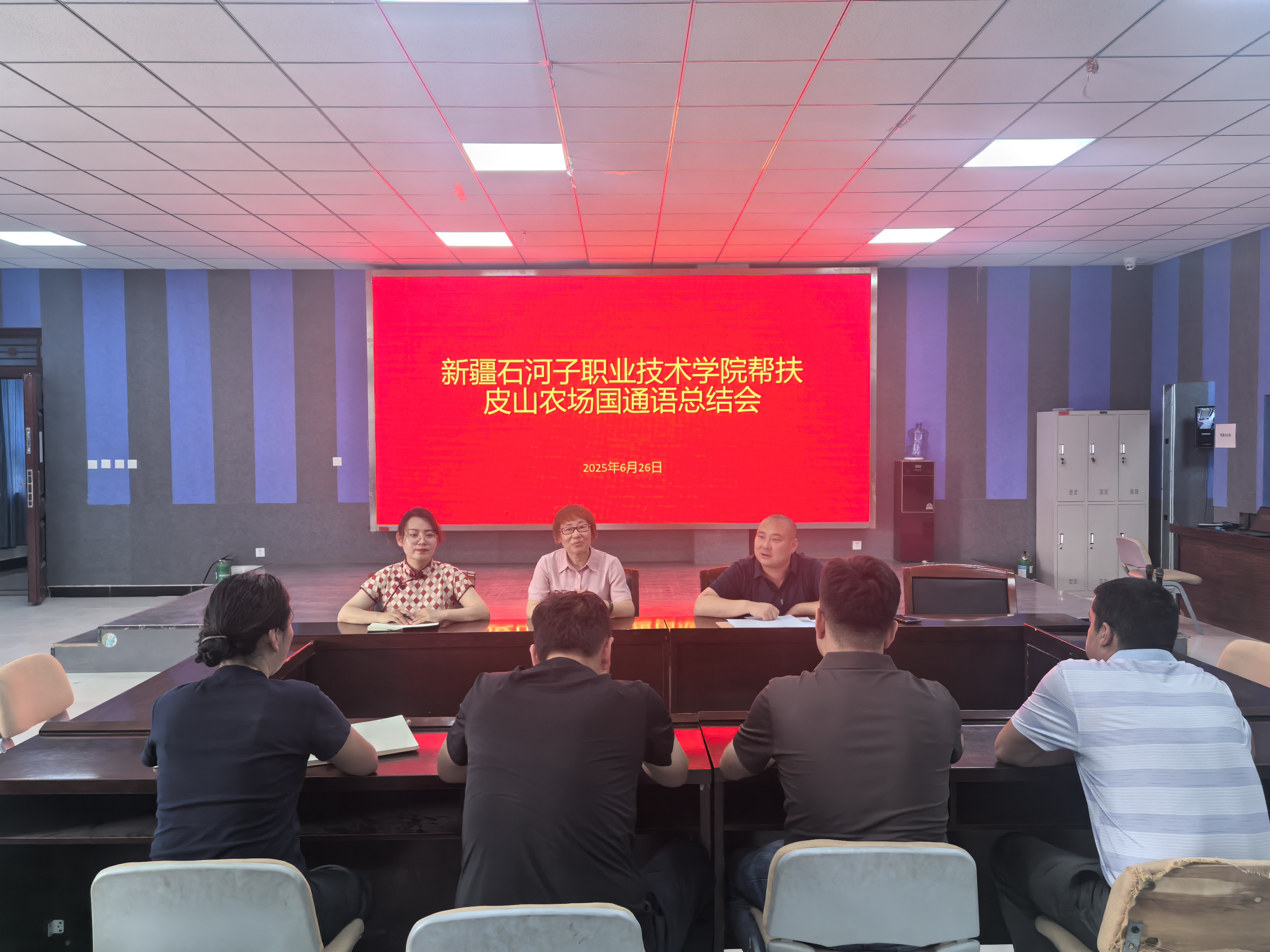6月26日上午,召开Beat365中文官方网站帮扶皮山农场国通语总结会。皮山农场国通语负责人赵圆圆对帮扶成效进行简要汇报,她表示在石职院的大力帮扶下,农场积极构建“学校+连队+家庭”起三位一体教学体系,统筹优势资源,提高培训师资力量,常态化开展夜校学习,分层培训效果显著。职工群众的“五个认同”显著增强,各民族交往交流交融更加紧密。李芳书记介绍,报告中的数据背后,是学校“精准滴灌”的帮扶实践。学校党委对国通语帮扶工作高度重视,组建由20名国通语骨干教师的帮扶团队,每月选派骨干教师开展“送教下乡”“云端课堂”等活动,建立“专家库+资源包”长效机制,切实解决了皮山农场国通语教学资源供给不足,师资力量薄弱的问题,让语言能力真正转化为致富能力。吴晓晖书记表示,看到职工群众从“不敢说”到“主动说”,从“学语言”到“用语言谋发展”,更加深刻体会到,国通语不仅是交流工具,更是铸牢中华民族共同体意识的“根”与“魂”。