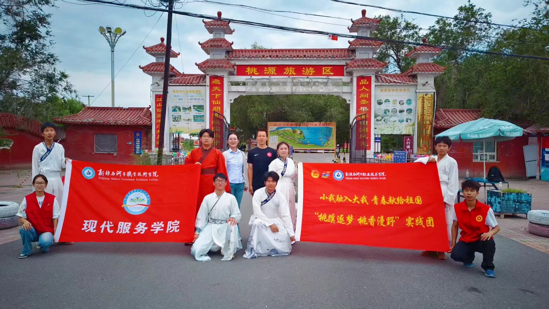 “银龄筑梦・春晖行”实践团走进石河子银龄养老院,不仅为老人们献上了歌舞、朗诵等精彩纷呈的文艺表演,更与老人促膝谈心,聆听那段峥嵘岁月里的红色故事,在互动中传递着温暖。微光实践团来到石河子特殊教育学校,通过手工教学、游戏互动陪伴特殊儿童,用爱心与耐心,点亮了孩子们纯真的微笑。“桃蹊逐梦 桃香漫野”实践团深入143团桃源景区,助力果农采摘、包装蟠桃,并借助直播带货、短视频推广等方式拓宽销售渠道,让香甜的蟠桃走向更广阔的市场。“云端芳翼 翼彩花田”团队赴石河子花园机场,参与旅客引导、行李托运等志愿服务,同时实地学习航空服务全流程,将课堂所学知识转化为实践能力。“通语筑疆 语脉同心”团队在石河子第五幼儿园开展普通话推广活动,通过儿歌、绘本故事等形式激发幼儿学习兴趣;“戈壁征帆起 红旗照征程”团队服务石河子宾馆,协助完成前台登记、客房清洁等工作,以扎实的专业素养赢得了宾客的一致好评。
