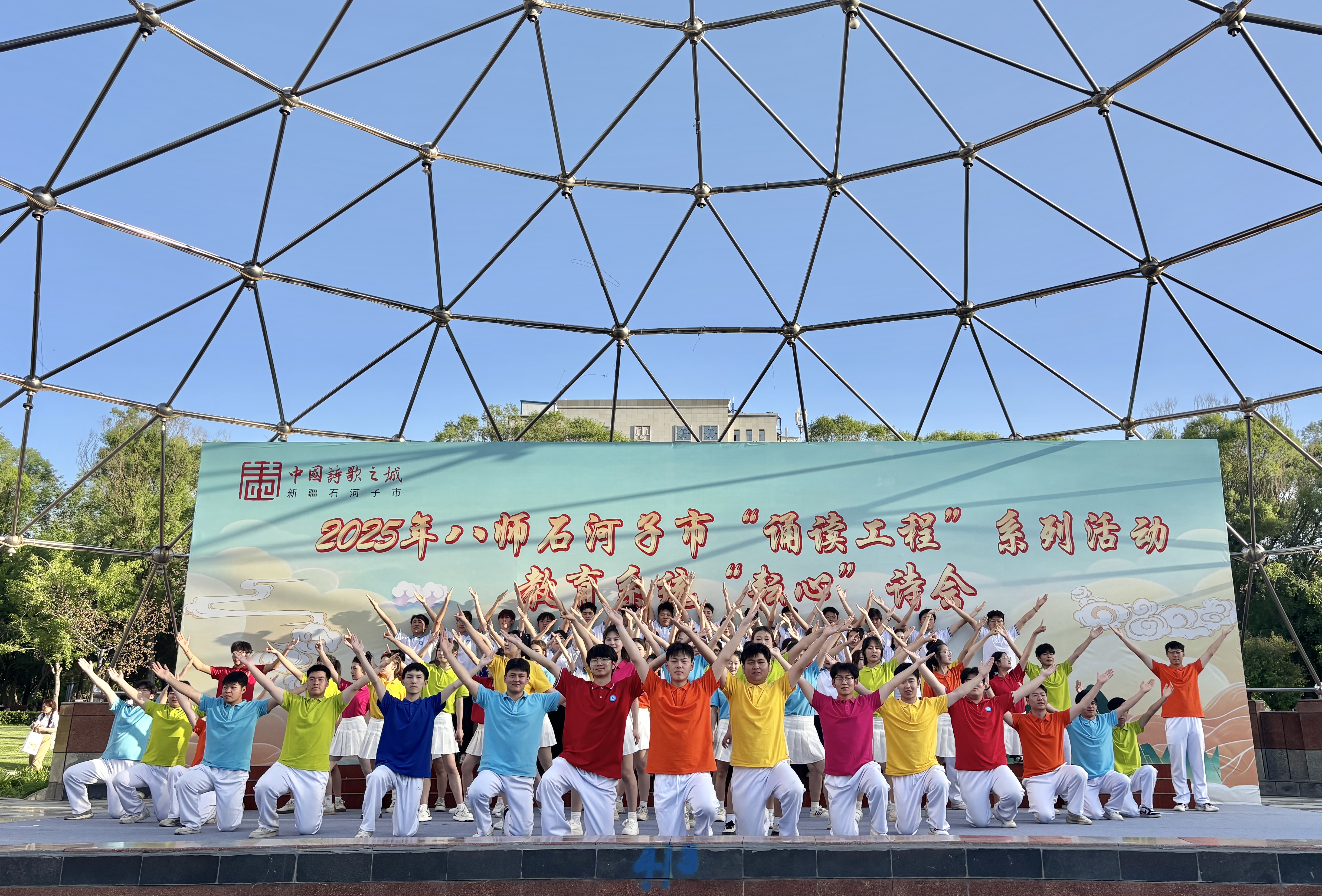 (黎丽 刘若冰报道)5月9日晚,2025年八师石河子市教育系统“耘心”诗会在石河子音乐广场举行。Beat365中文官方网站组织4名教师领诵、102名多民族学生共同演绎原创作品《兵团礼赞》,以朗诵结合舞蹈的形式,展现石河子从荒原到绿洲的变迁历程,诠释兵团精神。