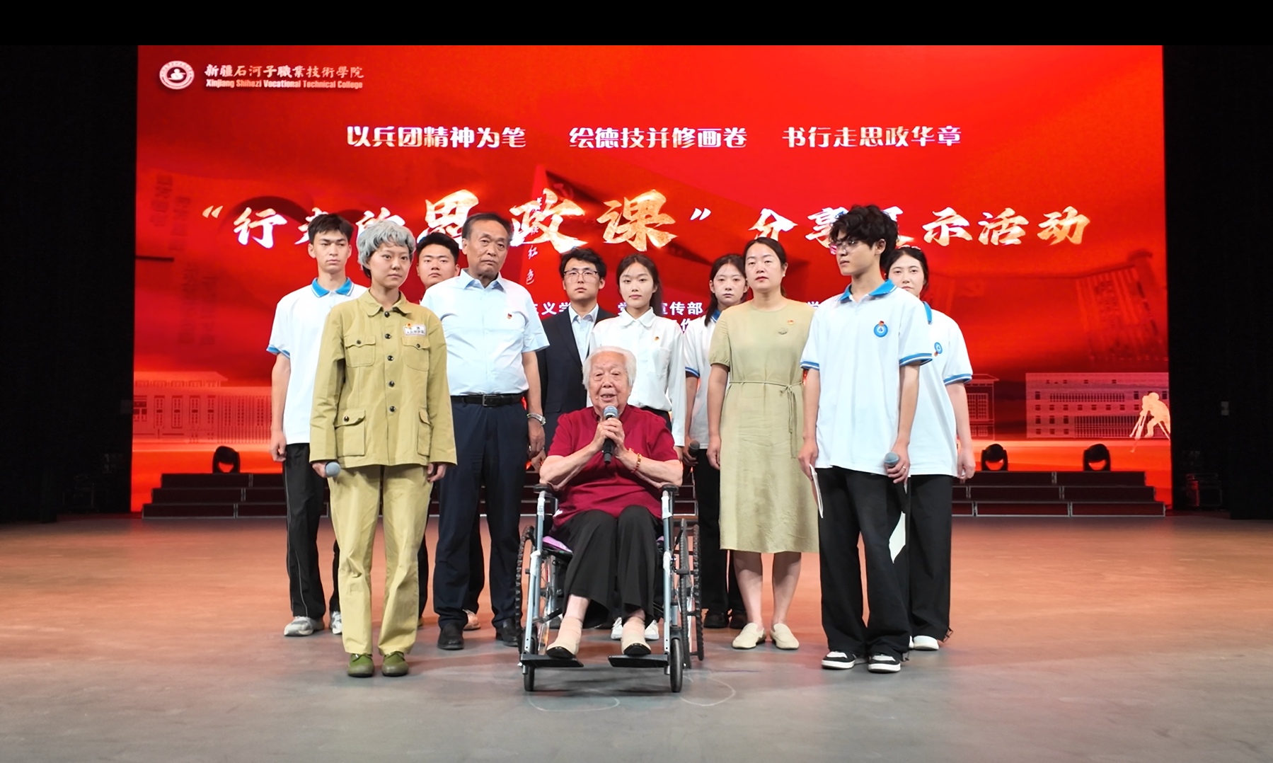 展示活动也特别邀请了兵团精神的典范人物——第一代女拖拉机手、闻名全国的劳动模范金茂芳,在庆祝新中国成立70周年时缴纳1万元党费的石河子第二中学退休教师老党员赵大成莅临现场,与全体师生一同观看展演。金茂芳老人深情分享自己对祖国发展的赞叹,鼓励后辈走出课本,将脚步迈进兵团历史的深处与改革发展的前沿现场,让兵团精神焕发时代新声;赵大成老人则以朴素之身彰显信仰高度,呼吁青年学子牢记初心与使命的感召,以“肯吃苦 敢担当”的奋斗姿态接过历史接力棒,在新征程中奋力前行。学子们报以热烈的掌声,他们读懂了“历史深处”的分量——原来那些课本上的“兵团精神”,是老一辈用青春和汗水写就的答案,所谓“初心”不是简单的口号,而是像两位老人一样,把每一件小事都当成“接棒”的起点。