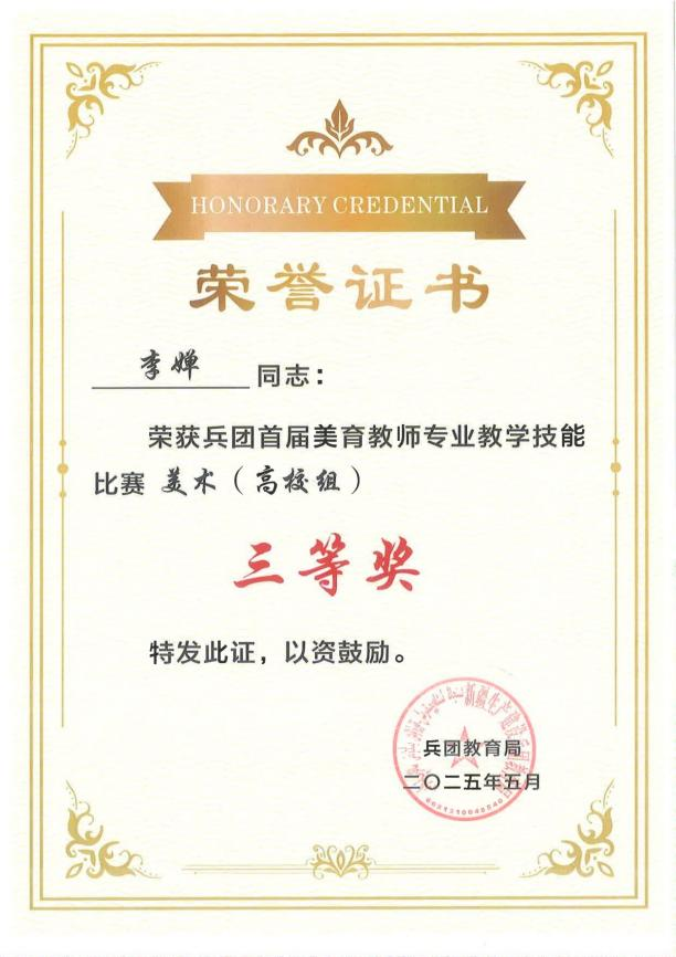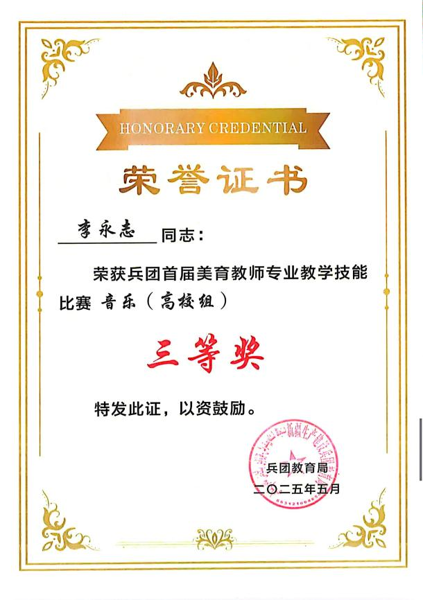 (李玲玲 报道)近日,在2025年5月圆满落幕的兵团首届美育教师专业教学技能比赛获奖结果正式公布。本次比赛由兵团教育局主办,设置小学组(含中职)与大学组两大组别,62名教师同台竞技,我校公共基础学院李永志老师、现代服务学院李婵老师凭借深厚的专业素养与精湛的教学技艺,双双荣膺大学组三等奖。此次佳绩,不仅是两位老师个人教学风采的生动展示,更是我校长期耕耘美育沃土、践行“以赛促教、以美育人”理念的成果。