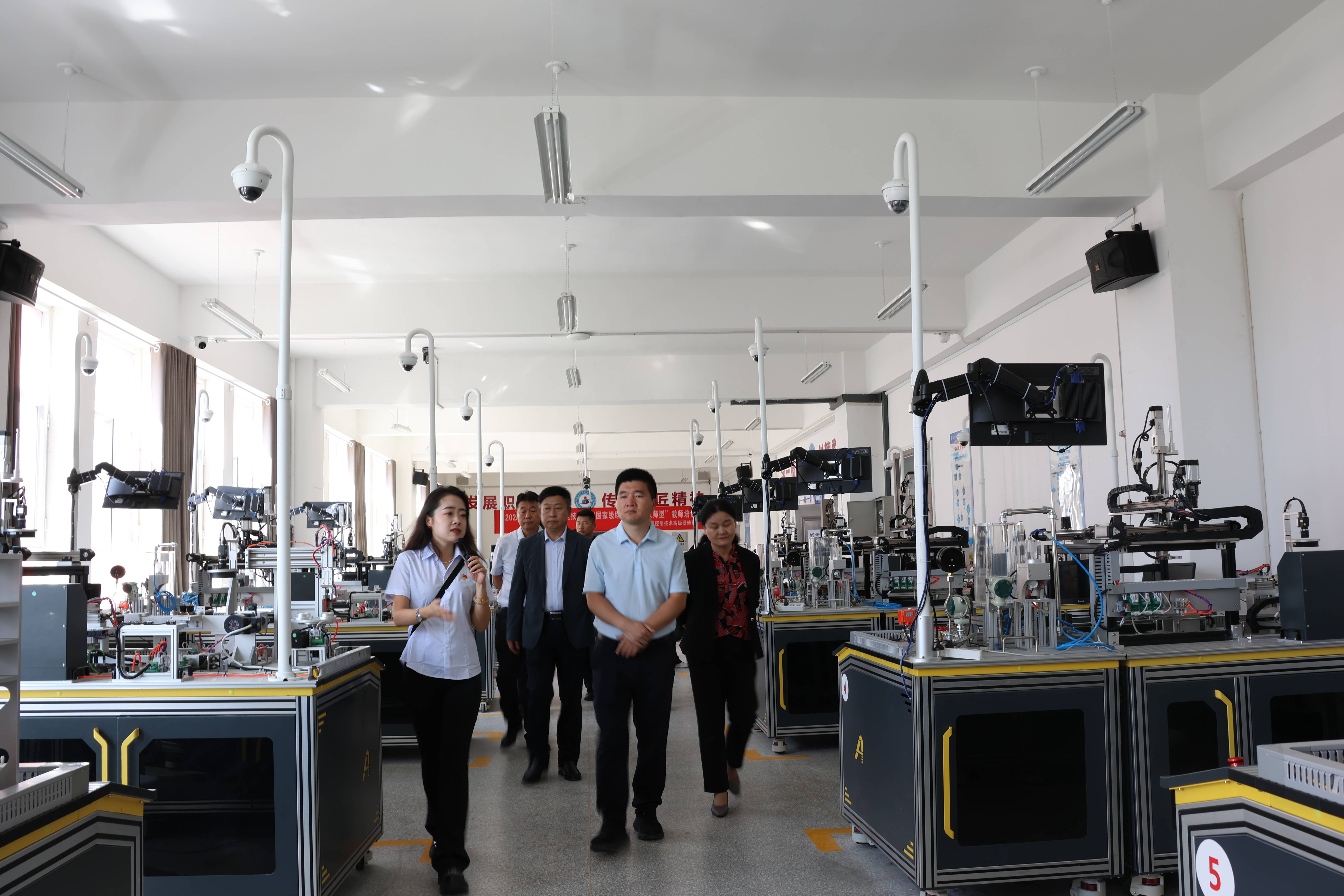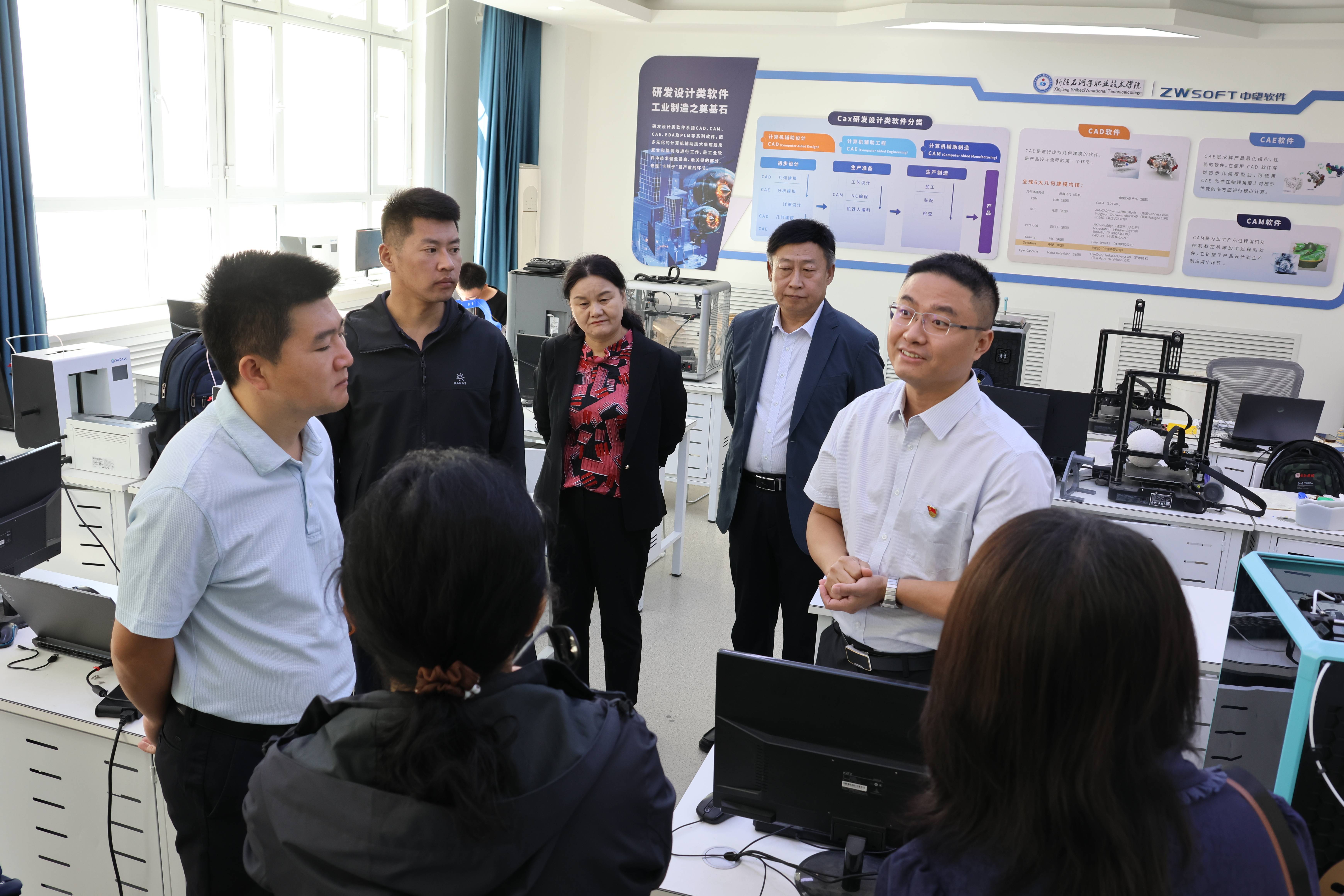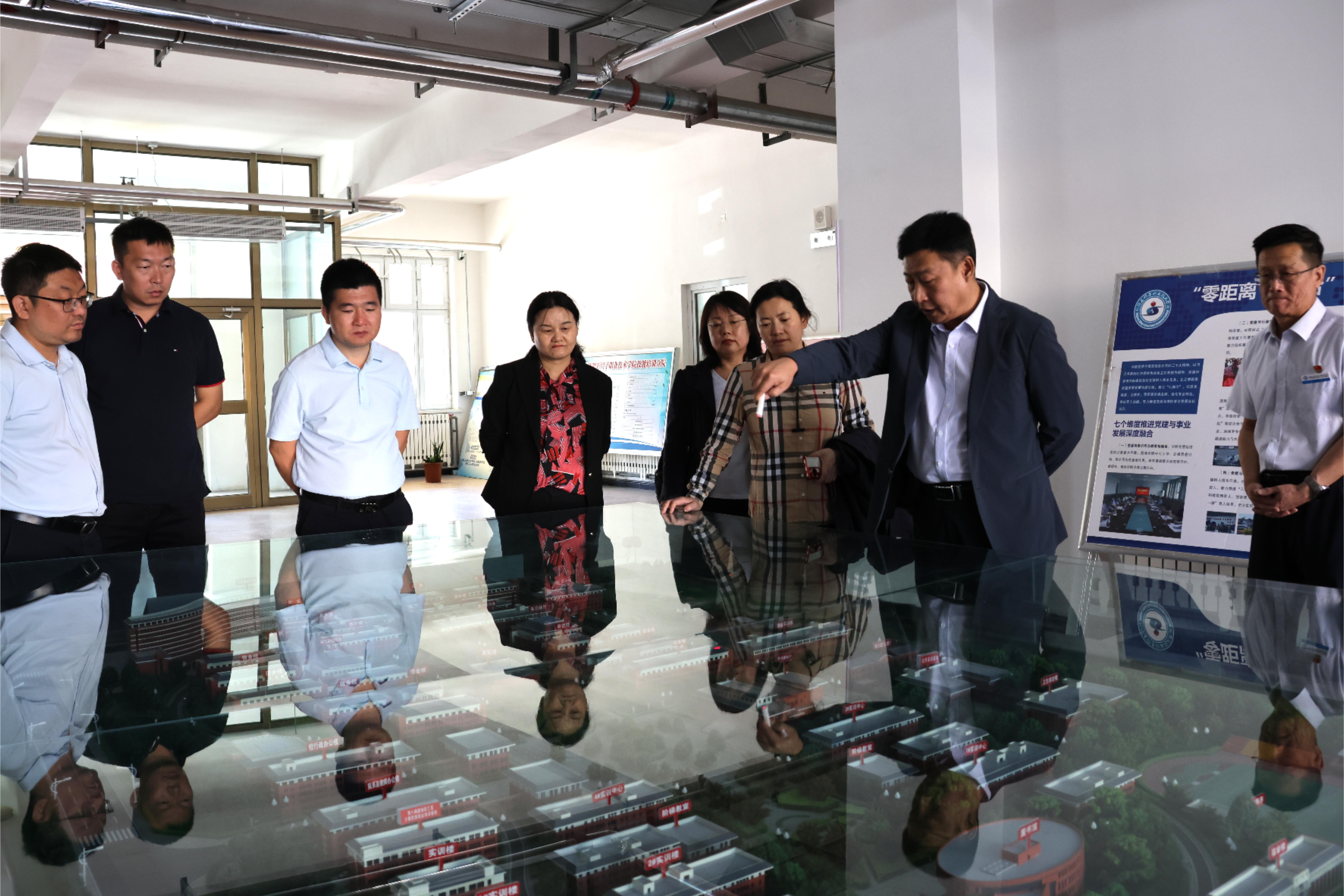 考察组一行先后走进学校的中望产业学院、工程实践中心、爱国主义教育基地、创新创业学院及公共实训基地。学院相关负责人围绕场地建设规划、教学运营模式、校企合作成果,以及服务区域产业发展的具体举措展开详细介绍。考察组重点了解产教融合育人模式、实训设备配置与使用情况及学院在社会服务领域的贡献,特别是在人社部门支持下,开展的无人机操作、厨师技能、电商运营等培训工作,充分肯定了学院在助力区域劳动力素质提升、服务产业人才需求方面的积极贡献。在爱国主义教育基地,考察组沉浸式感受学院以红色文化铸魂育人的浓厚氛围,对学院将思政教育与职业教育深度融合的创新实践予以高度认可。