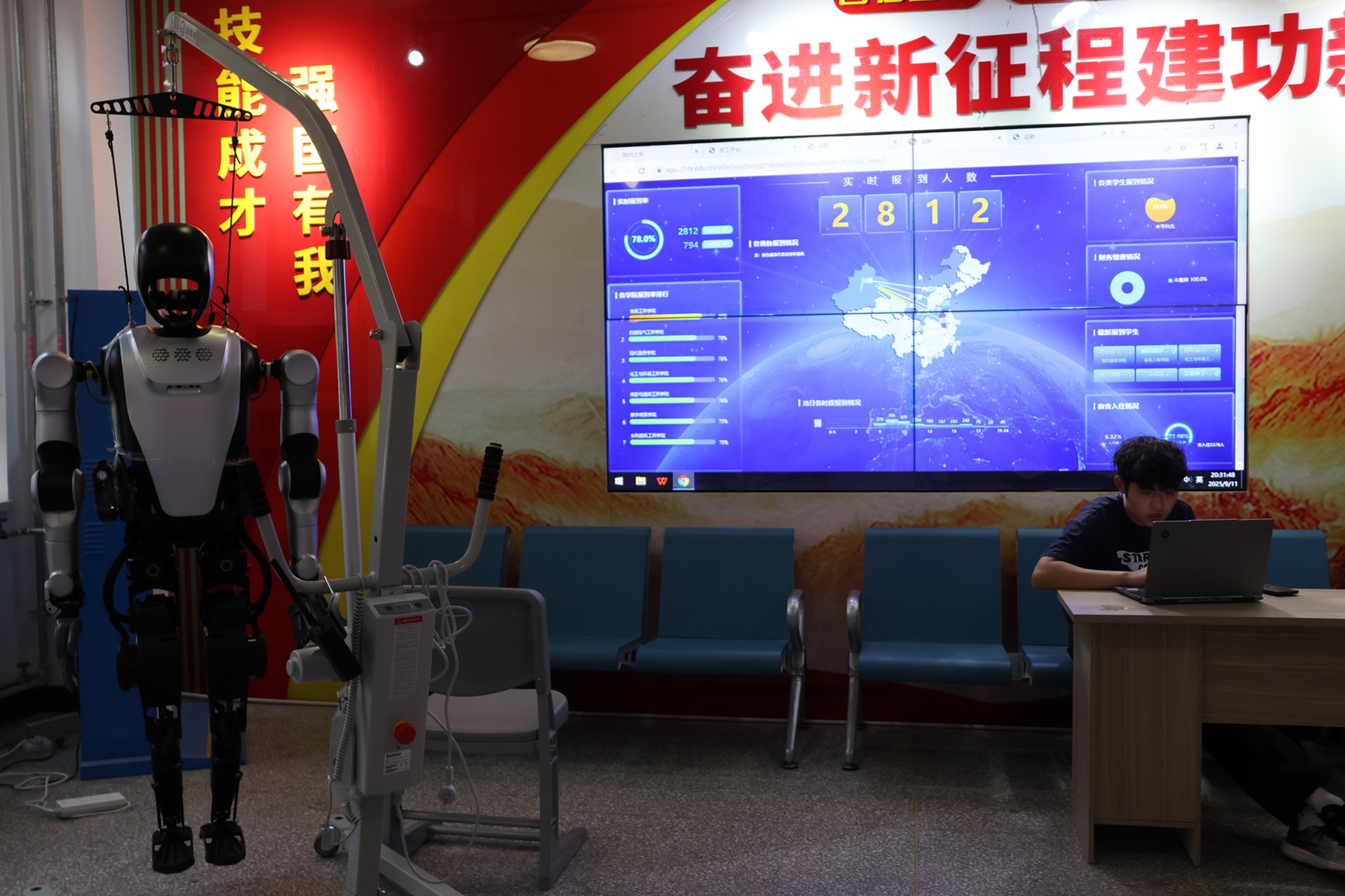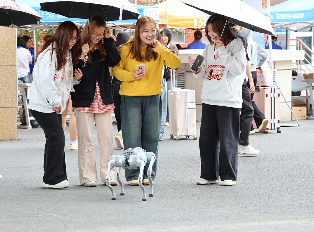 科技元素是本届迎新活动的一大亮点。报到现场,智能设备全程“在线”:身形小巧却力量十足的配送机器人精准对接行李,安全运到宿舍;机器人“管家”热情地与新生及家长打招呼、互动,以欢快的语音送上祝福;憨态可掬的机器狗表演倒立、跳跃、握手等动作,科技感扑面而来。“你是第2658名报到的‘小萌新’”——报到墙上的电子计数器清晰记录着每一位新生的到来。