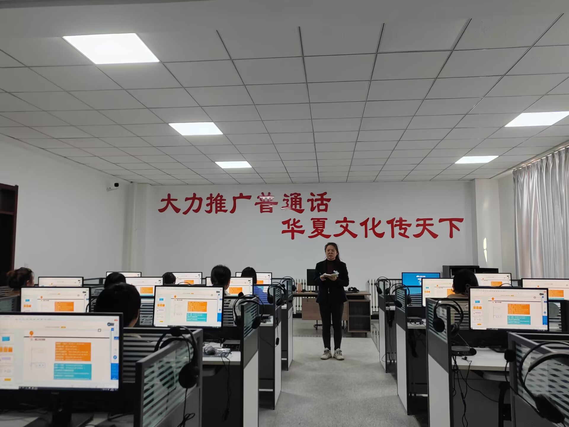 语文教研室构建“课堂+第二课堂”双轨模式,打造“分层化、趣味化”推普课程体系:马胜兰老师开设《铸牢中华民族共同体意识,从规范使用国家通用语言开始》开学第一课,解读推普意义;曾小凌老师设计“这些词你读对了吗”趣味语音测试,通过字词辨析、多音字朗读提升学生语音规范能力;张艺婷老师开展普通话水平测试专项训练,夯实学生语言基础;郭慧慧老师结合《诗歌》教学传授朗诵技巧,展现语言魅力;王雪纯、邓亚昕老师聚焦少数民族学生,开展“一对一”辅导,强化“听、说、读、写”能力,助力其融入校园。
