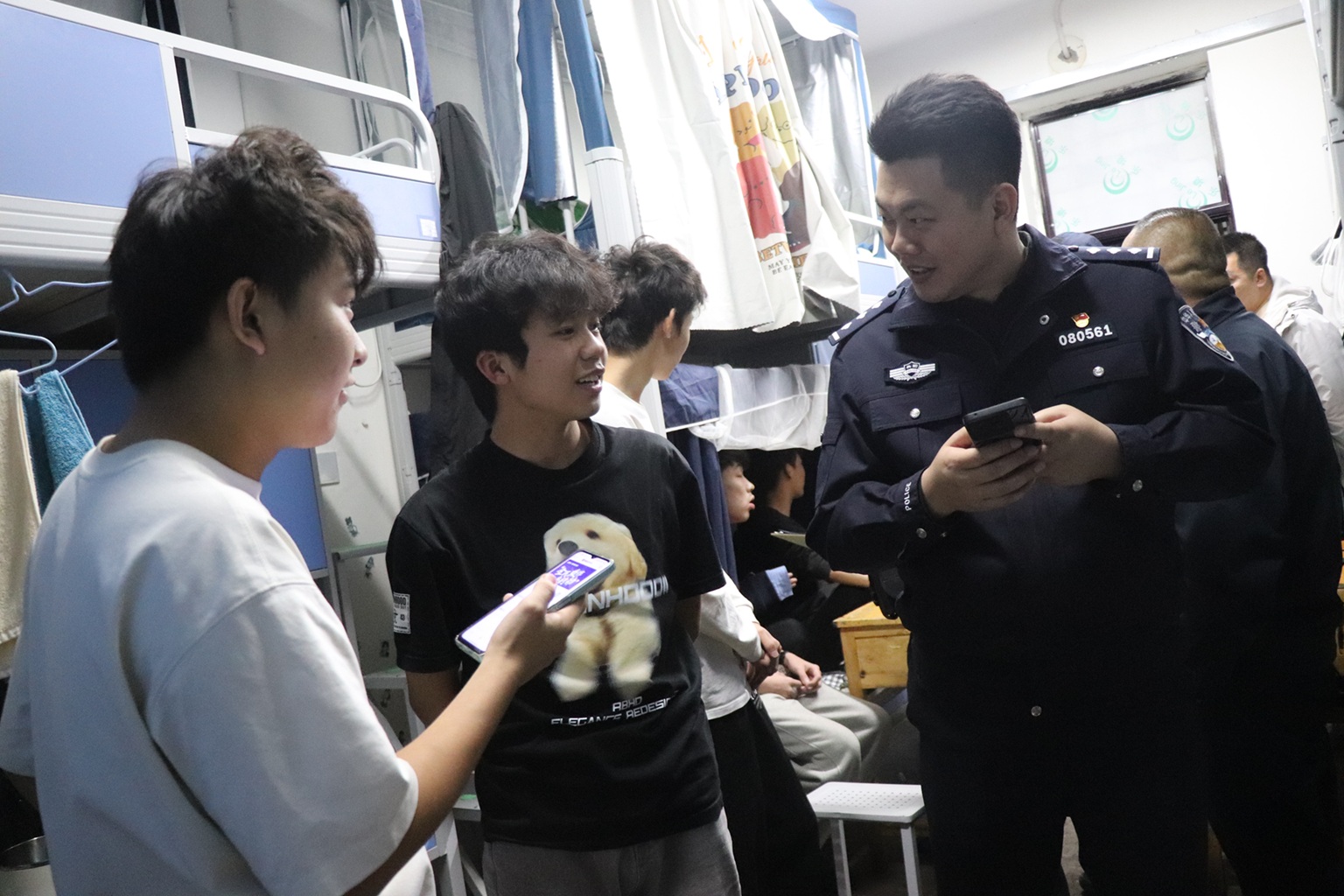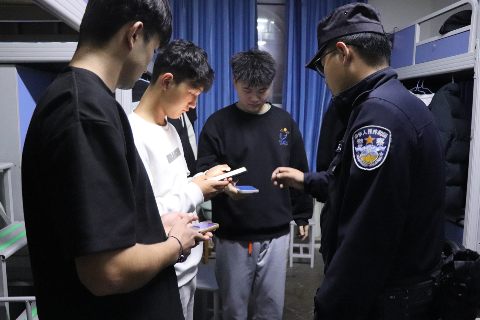 公安干警专攻风险防范,法治安全宣讲活动在各宿舍同步进行。经验丰富的民警们聚焦当前高发的刷单返利、冒充客服、网络交友、虚假购物等电信网络诈骗类型,结合身边真实发生的典型案例,深入剖析诈骗分子的常用话术与设陷手法。“凡是看到‘中奖信息’‘刷单变现’‘高薪兼职’等信息,大家一定要高度警惕,这些都是诈骗陷阱。”民警们深入浅出,教会学生如何快速识别可疑二维码和诈骗信息,耐心指导学生安装和使用“国家反诈中心”APP,开启预警功能。通过民警的讲解,同学们对诈骗的危害性有了更深刻的认识,纷纷表示在今后的生活和学习中会保持清醒头脑,提升辨别能力,坚决不做“电诈工具人”。